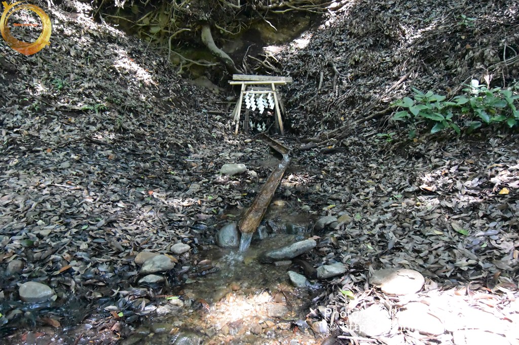 「有鹿窟」〈崖下から湧き出る湧水〉には 有鹿神社の宮司が作成した小型木製鳥居が建ちます