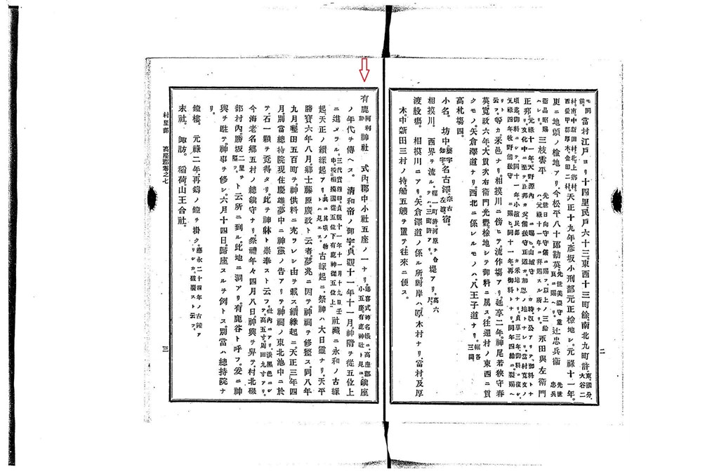 ○惣國風土記七十残訣云、相摸國高座郡有鹿神社、圭田五十七束八毛田、所祭忌部氏之祖神 太玉命也、天智天皇三年甲子夏五月、初行ニ 神禮、