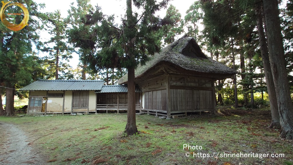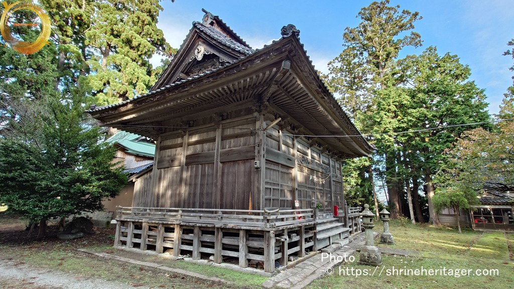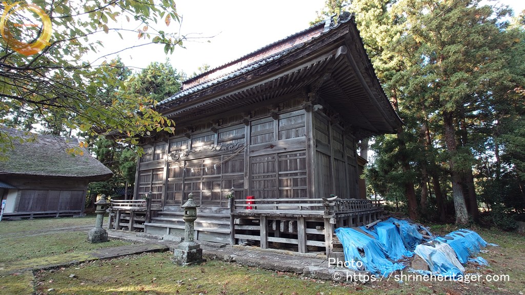 佐渡では数少ない明治期以前に建築された能舞台で、脇正面(わきしょうめん)を神社拝殿(じんじゃはいでん)に向けた配置が特徴的です。
