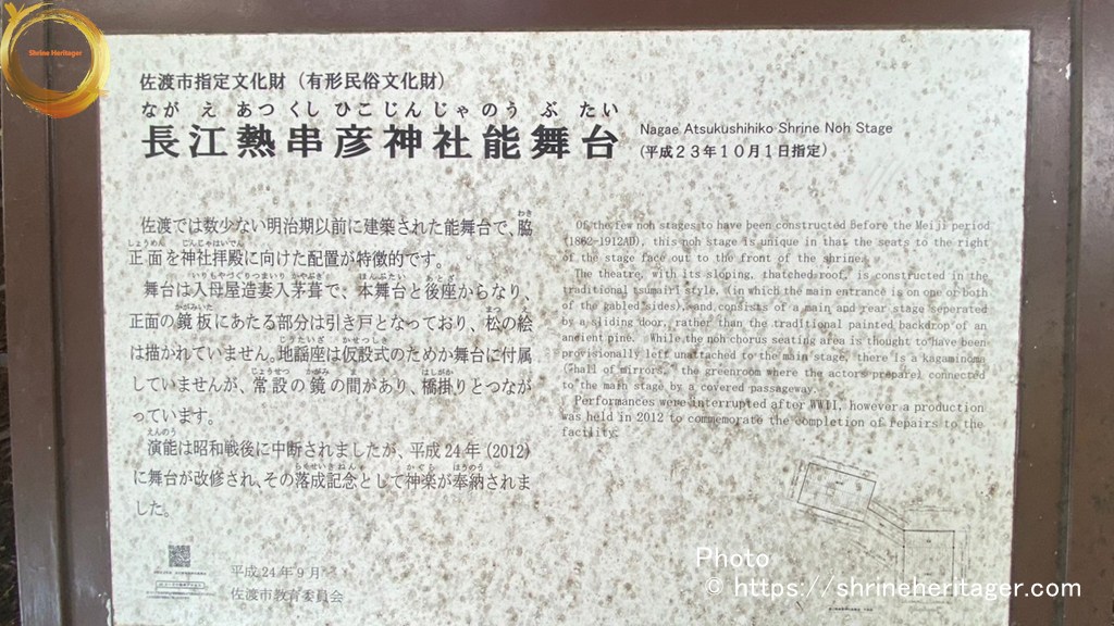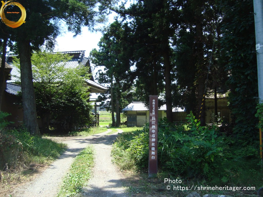 北側から境内に入って行くと「市指定文化財 長江熱串彦神社能舞台」の案内があります
