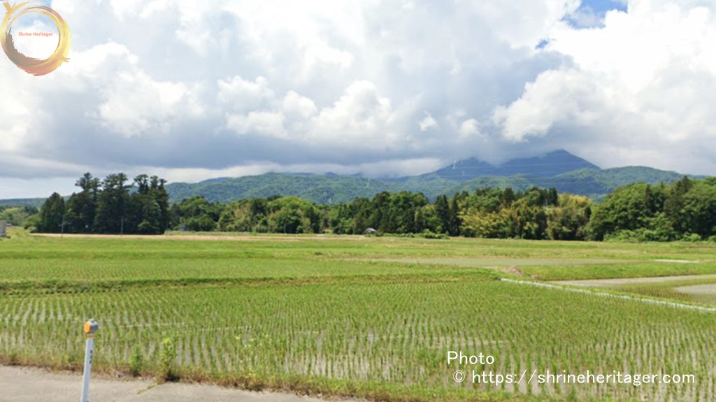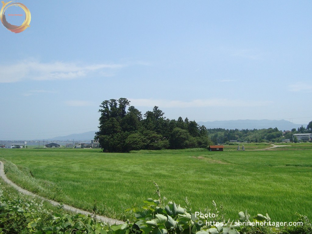 霊峰金北山(きんぽくさん)を背景に鎮座する 熱串彦神社(佐渡市長江)