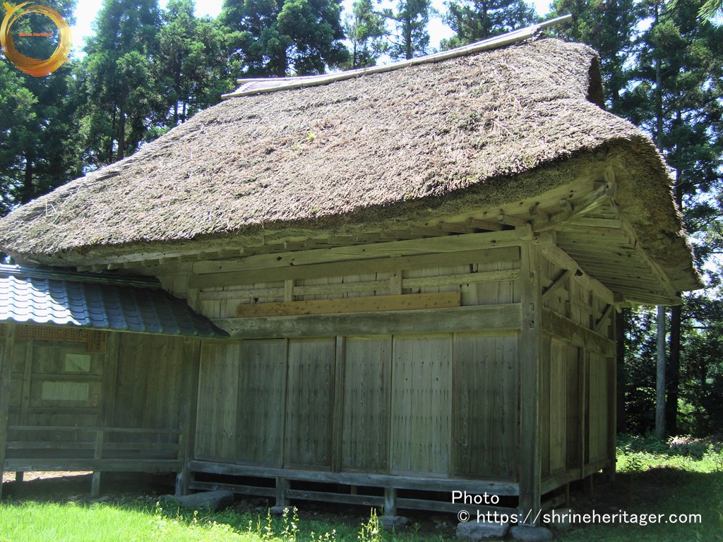 舞台は入母屋造(いりもやづくり)妻入(つまいり)茅葺(かやぶき)で、本舞台(ほんぶたい)と後座(あとざ)からなり、正面の鏡板(かがみいた)にあたる部分は引き戸となっており、松の絵は描かれていません。地謡座(じうたいざ)は仮設式(かせつしき)のためか舞台に付属していませんが、常設(じょうせつ)の鏡の間があり、橋掛(はしがか)りとつながっています。