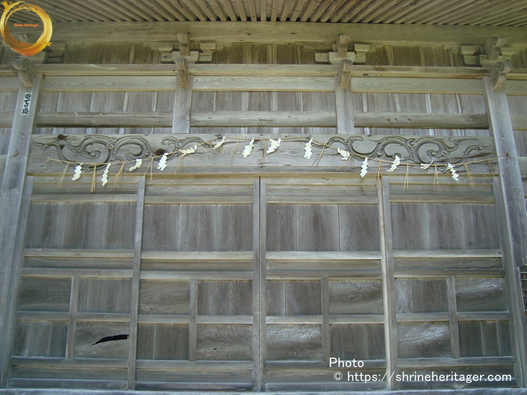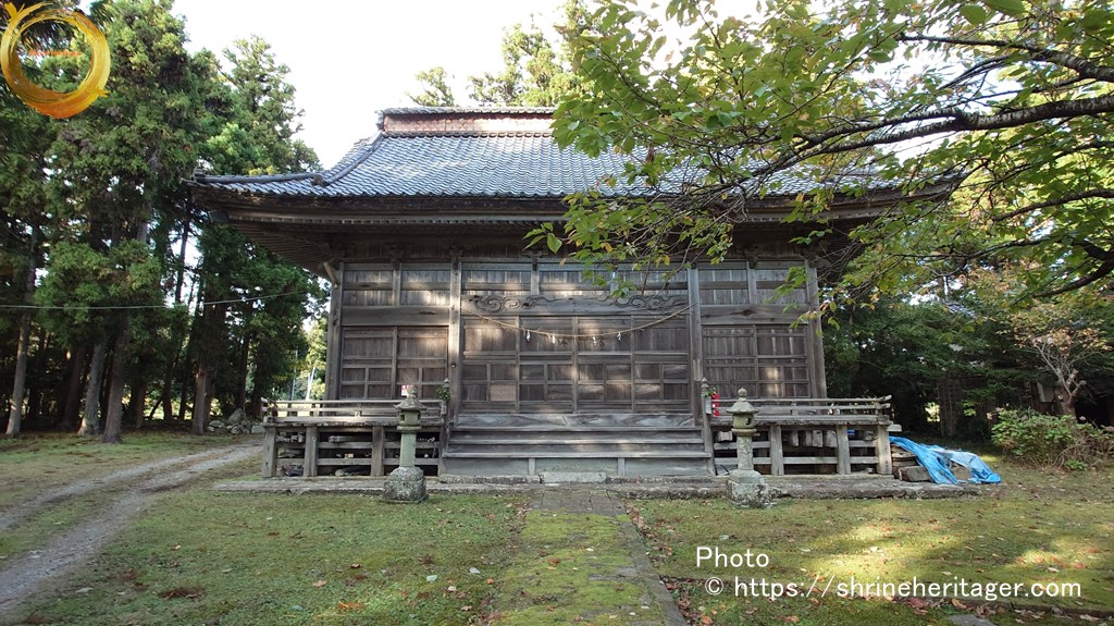 中御門天皇 正徳四年破損せし爲再建す、當時 除地高二石二斗六升八合附與せられしが、明治元年十月返上す、合祀 金山彦命はもと金北山に在り、里宮と稱して當村  上橫山村の共祀社なりしが、明治五年當社に合祀す、同六年郷社に列す、境内九百四十九坪(官有地第一種)、社殿は、本殿、拝殿、其他社務所、廻廊等の建物を備へ、鬱蓊たる古木四至をめぐり、左には夷港をひかへ、白帆を樹間に望むべく、眺望甚賞すべし、因に記す、