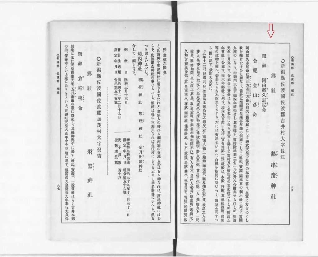 式内社  阿都久志比古神社について 所在は長江村に在す、〔略風土記〕今 熱串彦明神と稱す、゛〈現 熱串彦神社(佐渡市長江)〉と記しています