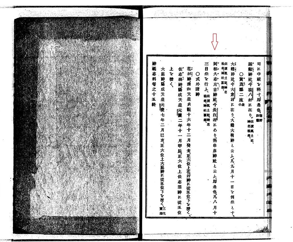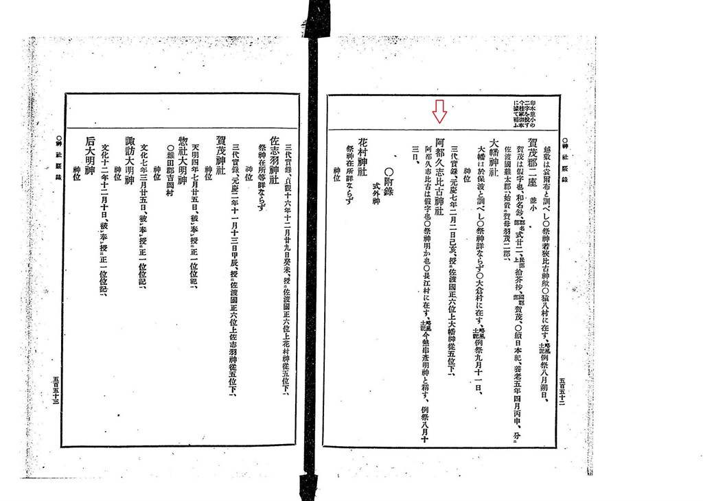 式内社  阿都久志比古神社について 所在は゛ 長江村にあり、熱串彦神社と云ふ、゛〈現 熱串彦神社(佐渡市長江)〉と記しています