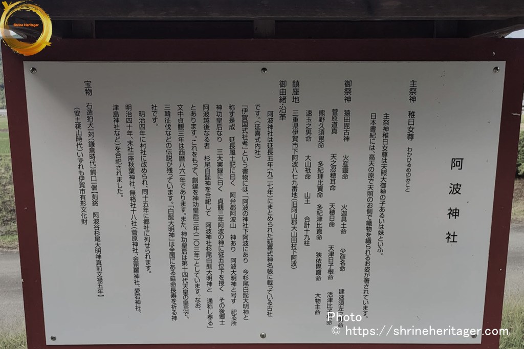 伊水温故に云く、「下阿波村 椙生社は村の總社猿田彦也、外に天神社あり、式阿波神社は神功皇后を祭る、此社見えず、天神と誤るなるべし」と、又、神名帳考證に、「阿波神社、在ニ 阿波村、天日方奇日方命、」