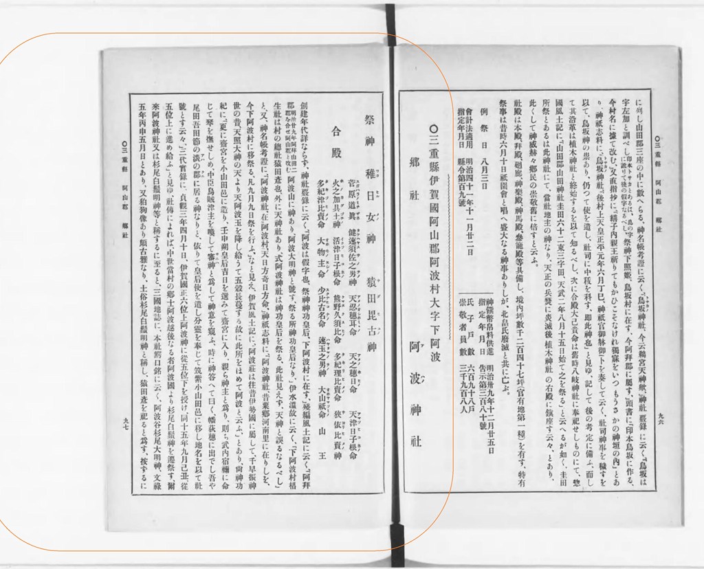 社格 村社(十五年五月郷社加列)所在 三重縣大九區下阿波村 (阿山郡阿波村大字下阿波 )