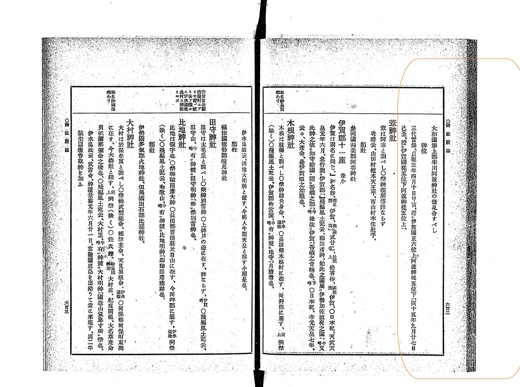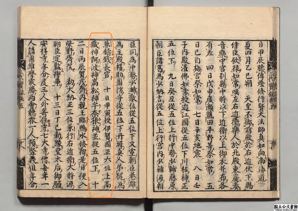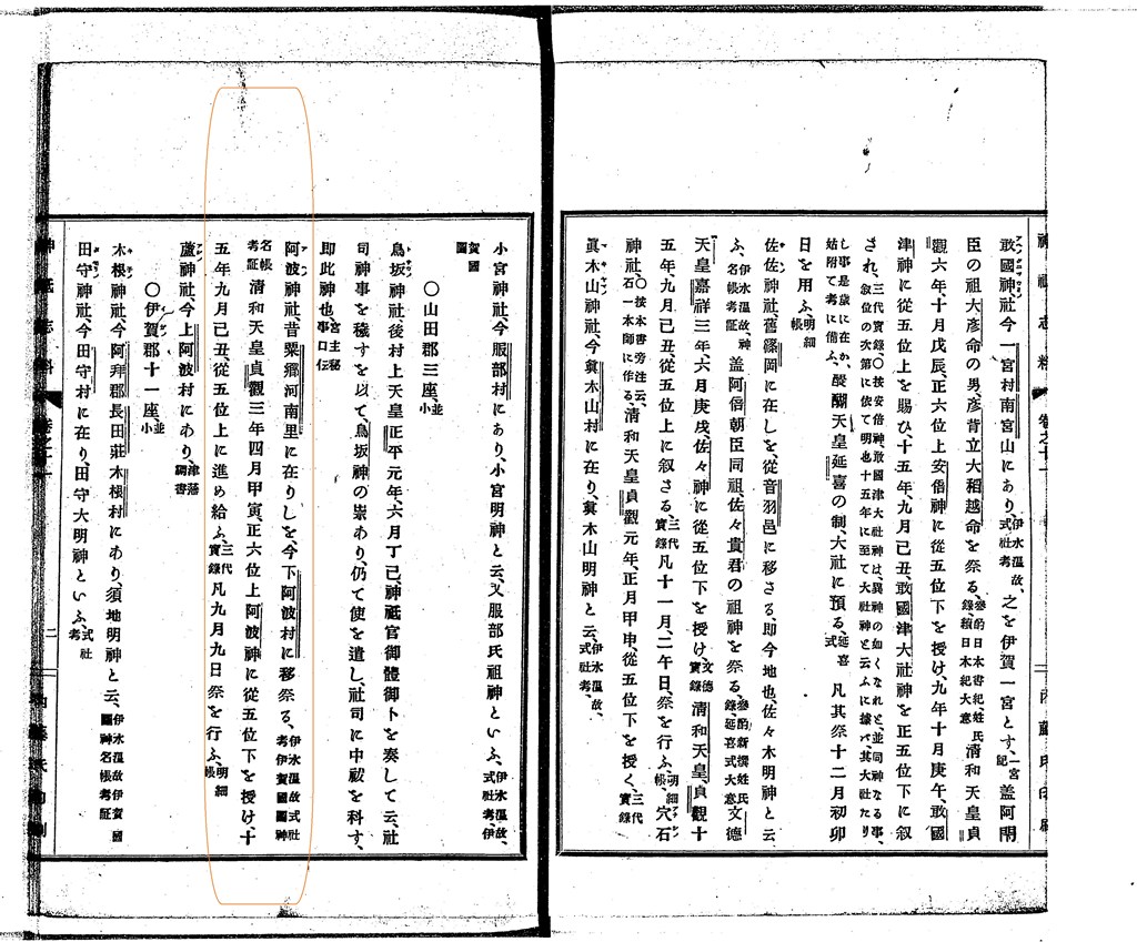 清和天皇 貞観三年四月十日甲寅 授二 伊賀國正六位上 阿波ノ神二 從五位下