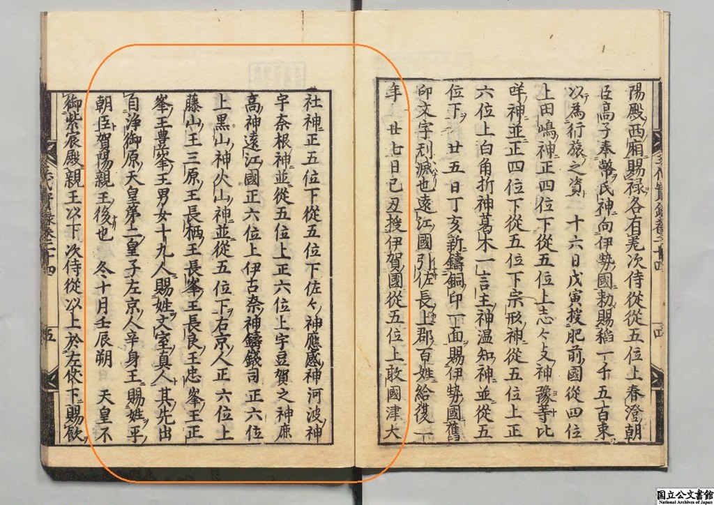 正六位上 伊古奈神 鑄錢司 正六位上 黒山神 火山神 並に從五位下をこの日 右京の人 正六位上 藤山王・三原王・長柄王・長峯王・長良王・忠峯王・正峯王・豊峯王ら 男女十九人に「文室真人(ふんやのまひと)」の姓を与えた