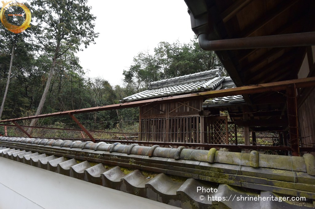 屋根は柿葺(こけらぶき)、早くから覆屋に入り当初材がよく残っています。小社の割には手の込んだ造りで、袖部は朱塗り、壁は胡粉(ごふん)塗り、組物・虹梁(こうりょう)・小壁を枢彩(すうさい)色仕上げになっています。