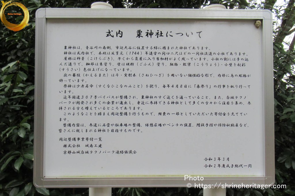 粟神社(あわじんじゃ)は 『粟神社記』に「第6代孝安天皇の御代 平間山麓の百舌ヶ原に少彦名尊と高皇産霊尊が降臨し少彦名尊が祀られたのが粟神社 高皇産霊尊が祀られたのが兜神社(旦椋神社)とある」延喜式内社 山城國 綴喜郡 粟神社(あはの かみのやしろ)です