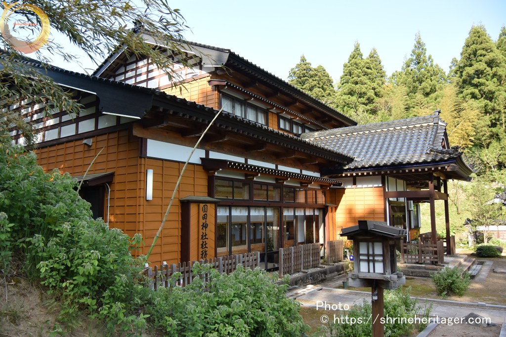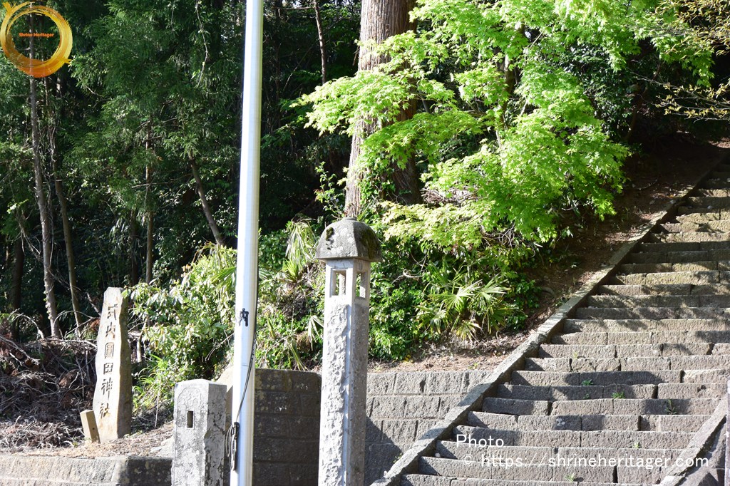 廷喜式神名帳所戟の神社と稱すれども、古記文書今考ふべきなし、口碑傳ふる所によれば 神代の昔 大國主神 高志國に來り給ひし時、此圓田原に來り龍ケ峯の下に船を繫ぎて上陸し玉ひし神社なりとて郷民龍ケ峯に社を建て國田明神と唱へて之を祀る、祈雨五穀豊穣等の祈願に靈験著しく郷民の崇敬厚かりし所なり、