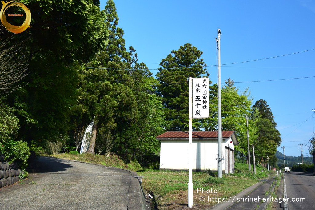 「式内 圓田神社 社家 五十嵐」とある銘板がある所を神社むの側に入って行くと駐車スペースとなります