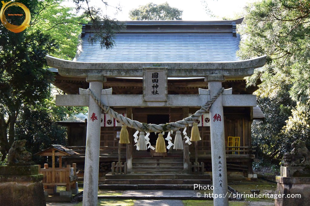 圓田神社(えんたじんじゃ)は 神代の昔 大己貴神が国土平定に高志に来た時 圓田沖に船を入れ龍ケ峰に船を繋ぎ上陸 郷民は龍ケ峰に一祠を建て奉斎創始 天武天皇(676年)巡察使中臣清麿が當社に参拜 從來の石祠から社殿を建立と口碑に伝わる 延喜式内社 越後國 頸城郡 圓田神社(まろた〈えんた〉の かみのやしろ)の論社です