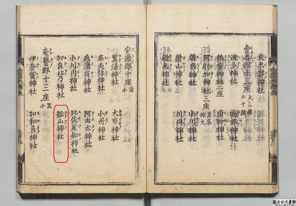 『延喜式神名帳』(927年12月編纂)に「舩山神社(ふなやまのかみのやしろ)」と所載の式内社について
