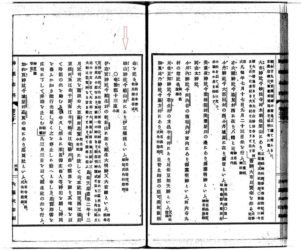 その中でも巻9・10を『延喜式神名帳(Engishiki Jimmeicho)』といい 当時〈927年12月編纂〉「官社」に指定された全国の神社(式内社)の一覧となっています