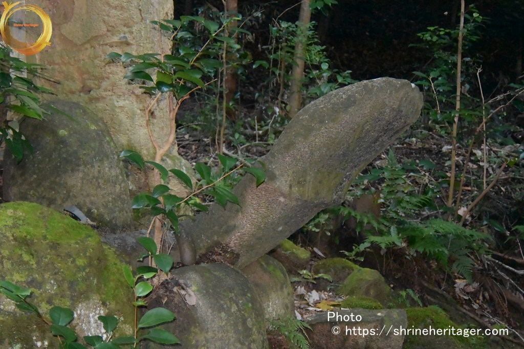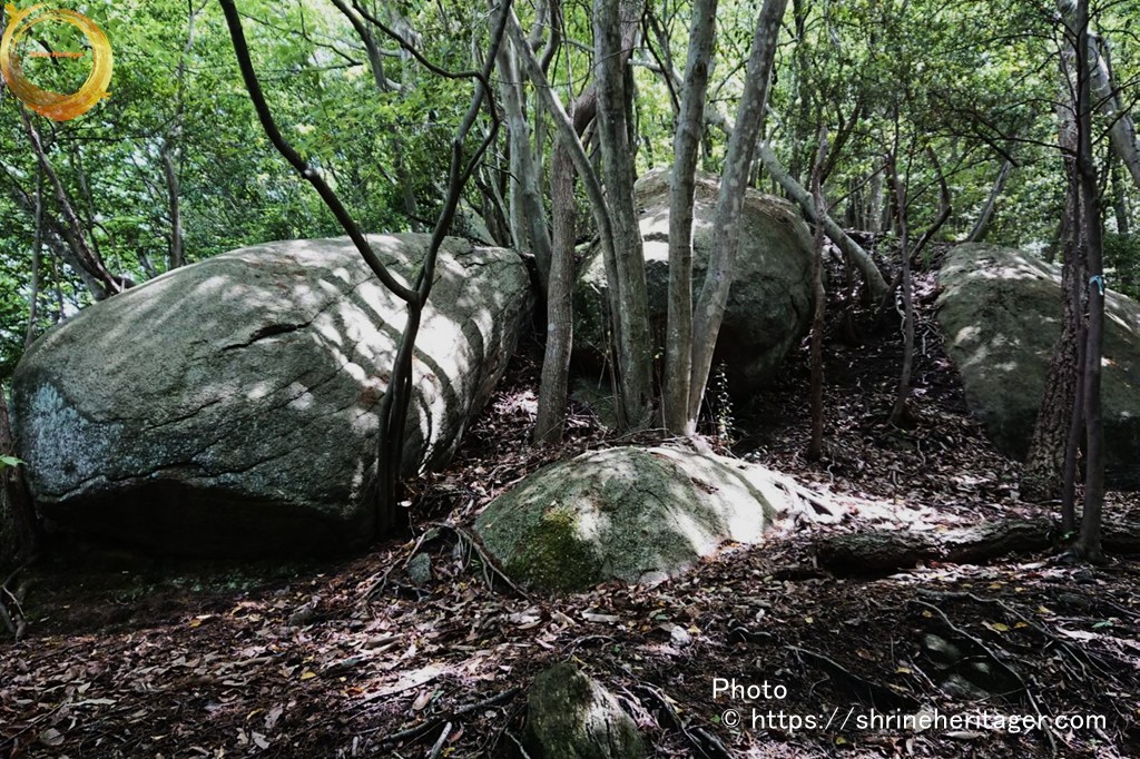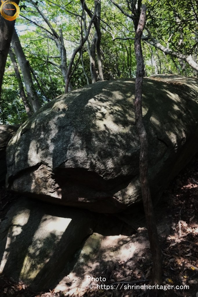 ※船上神社趾の上方向 矢田丘陵(やたきゅうりょう)八合目付近 丸木船の船底のような「三つの船石〈巨石〉」〈船上神社(ふなかみじんじゃ)の御神体〉