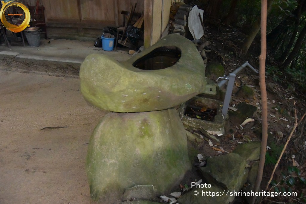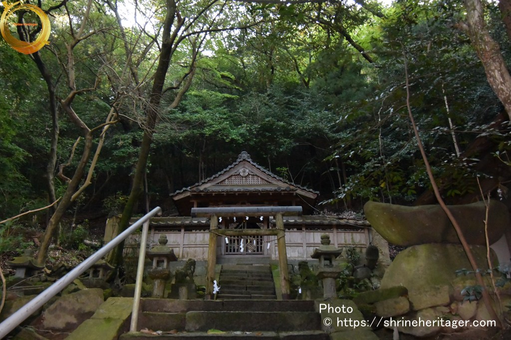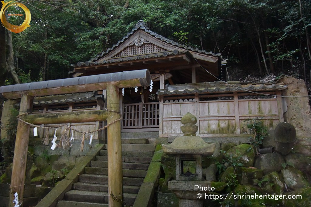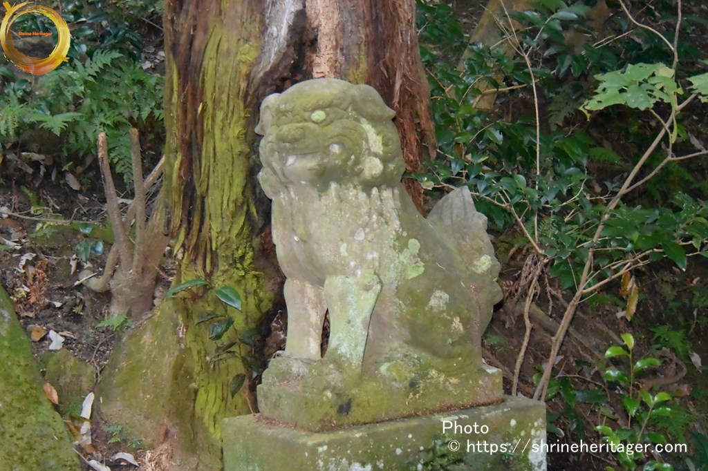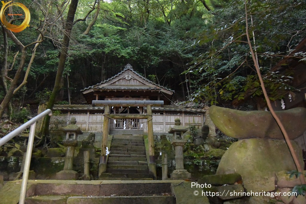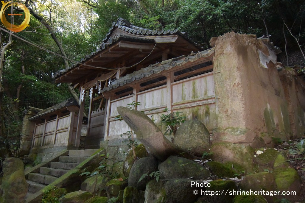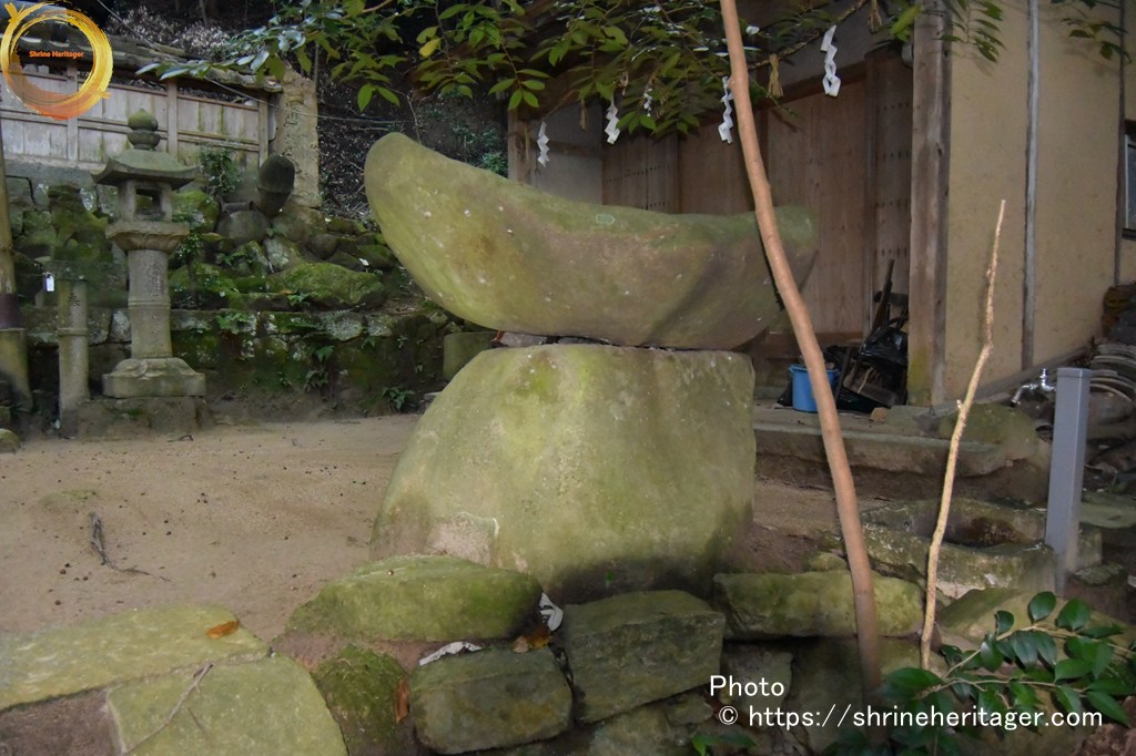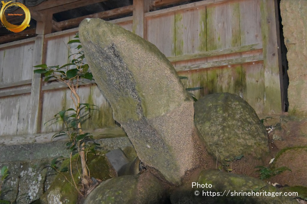 磐座(いわくら)信仰を伝える古社であり、拝殿横には立派な陽石が旧社地から移されている。