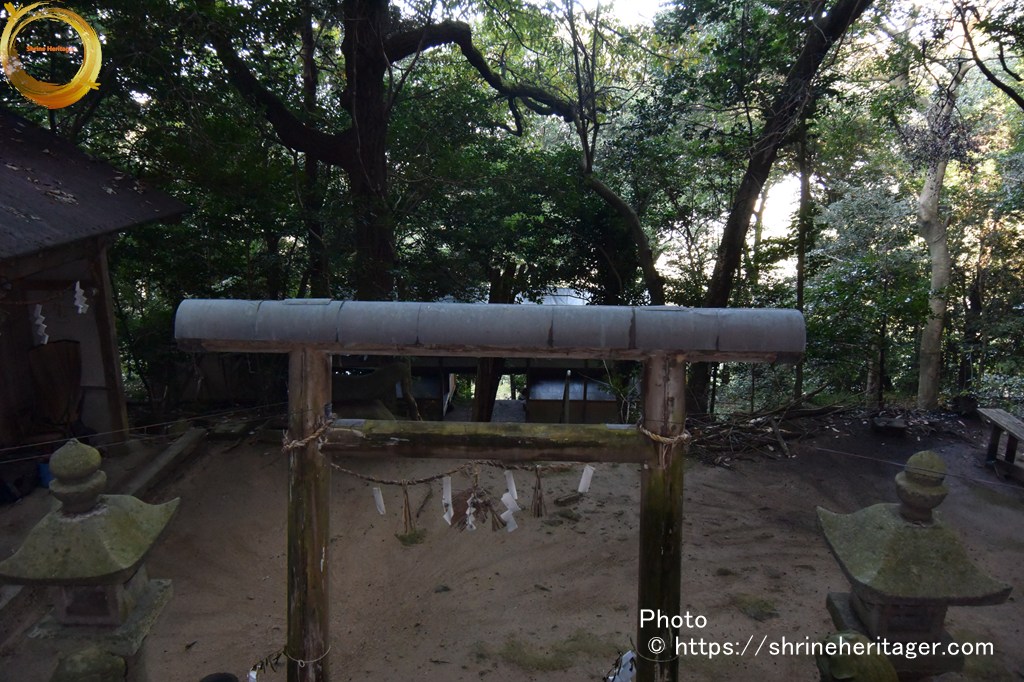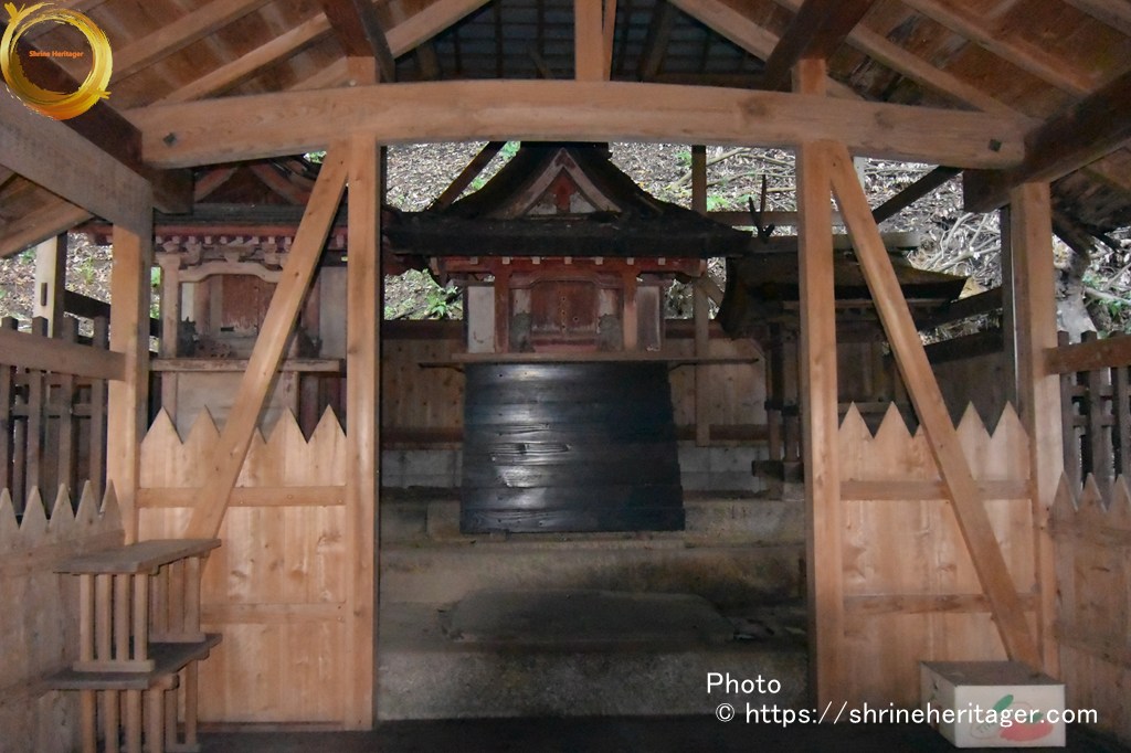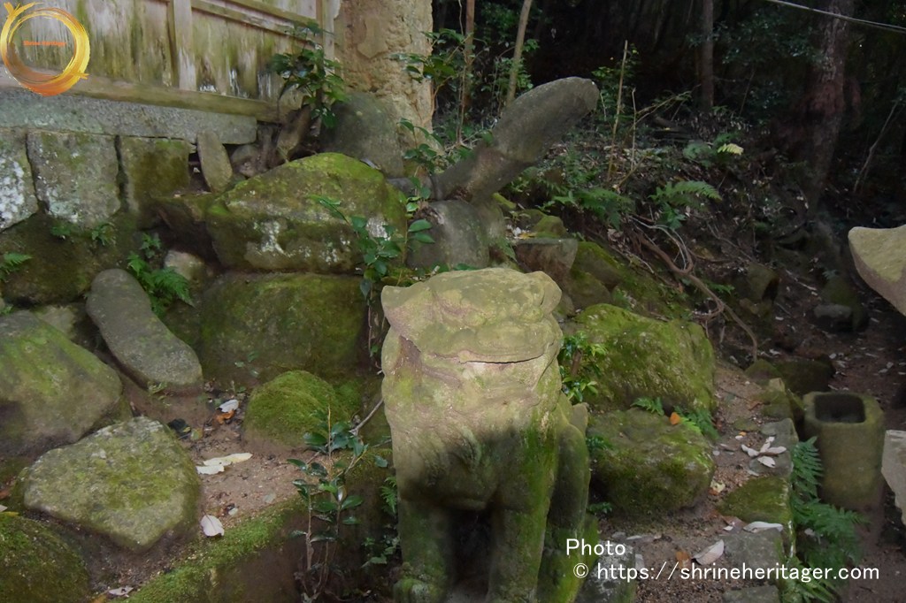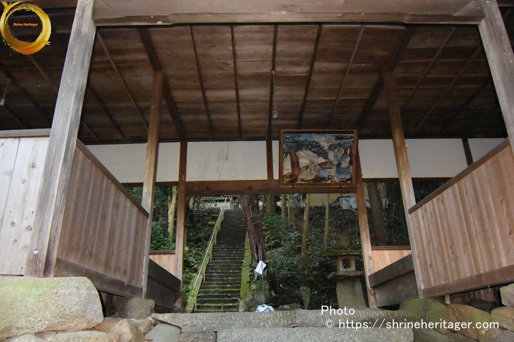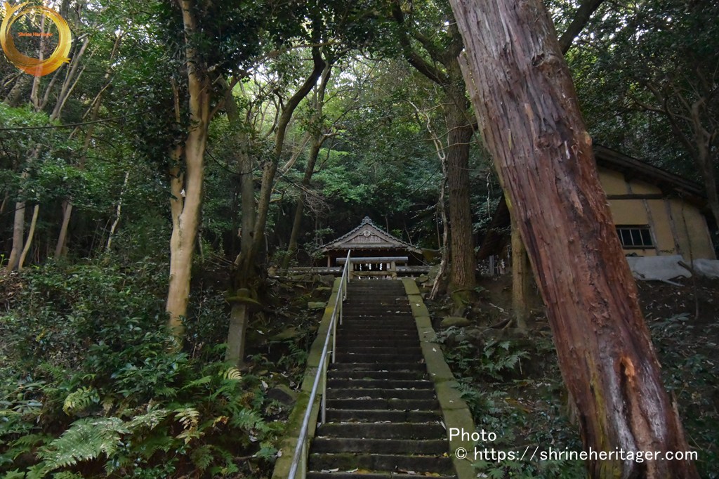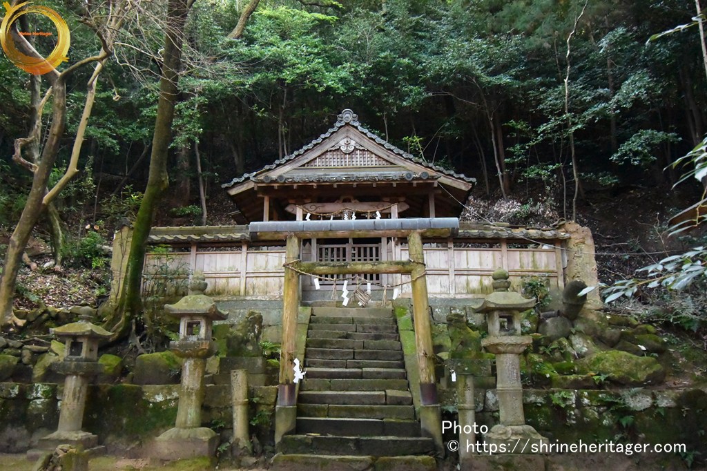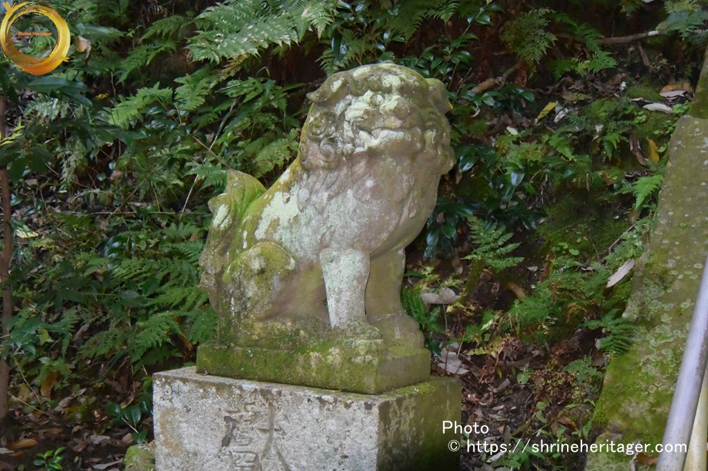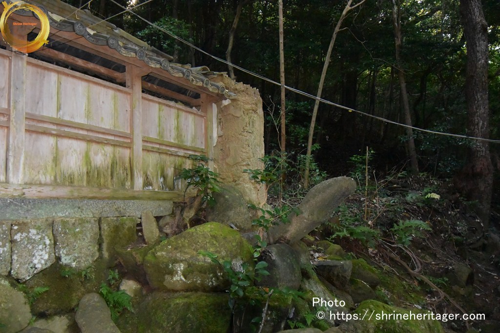 磐座(いわくら)信仰を伝える古社であり、拝殿横には立派な陽石が旧社地から移されている。