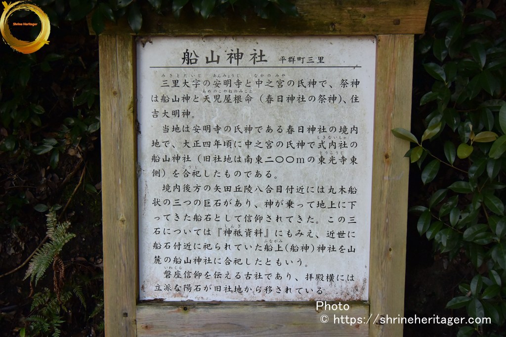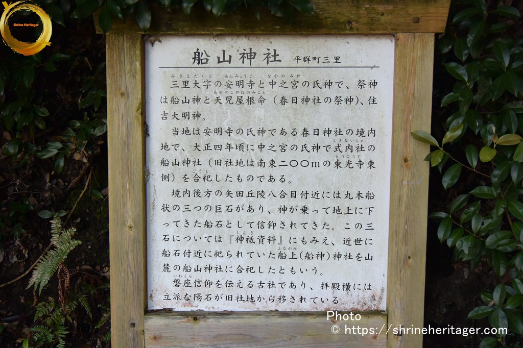 『延喜式神名帳』(927年12月編纂)に所載の「舩山神社(ふなやまのかみのやしろ)」と記す式内社の論社について