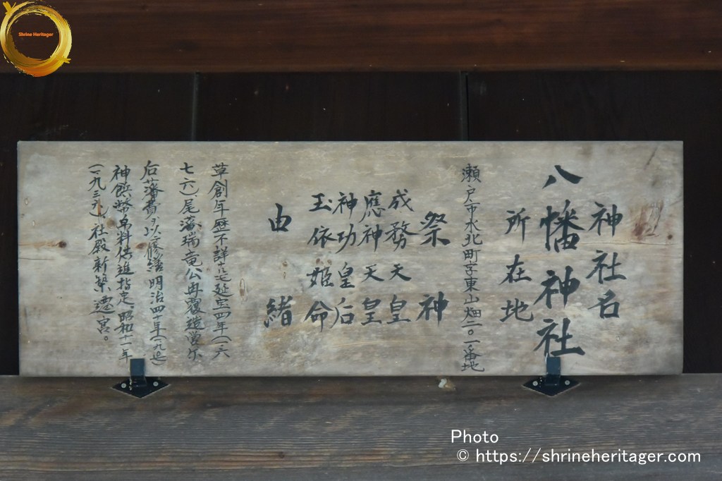 『式内社調査報告』に記される式内社 乎江神社の論社の一つとして 上水野村説があり その説では゛上水野村八幡社(現在の瀨戸市水北町)゛〈現 八幡神社(瀬戸市水北町))〉と記しています