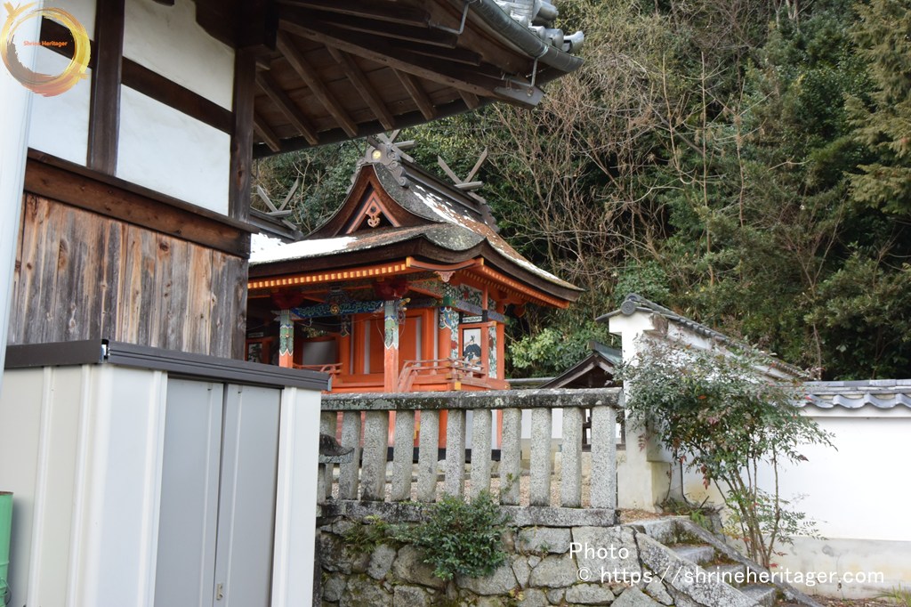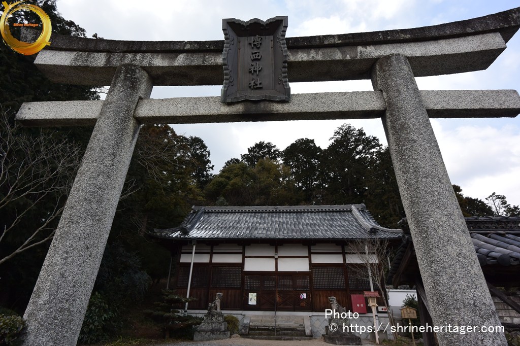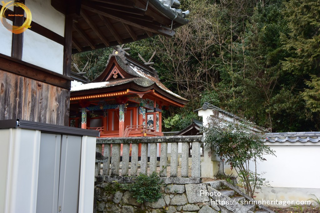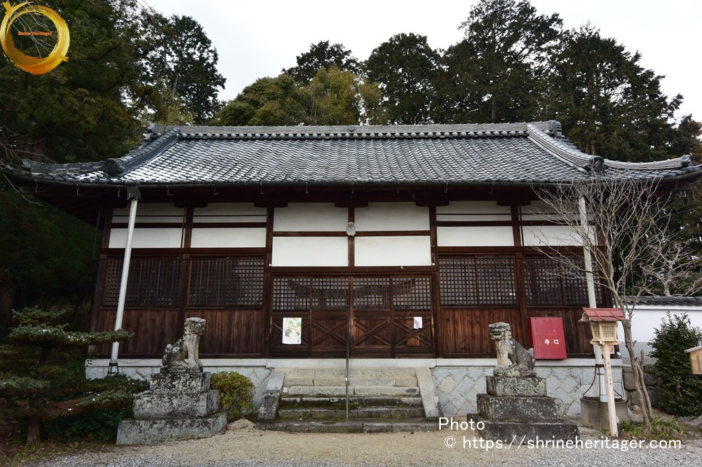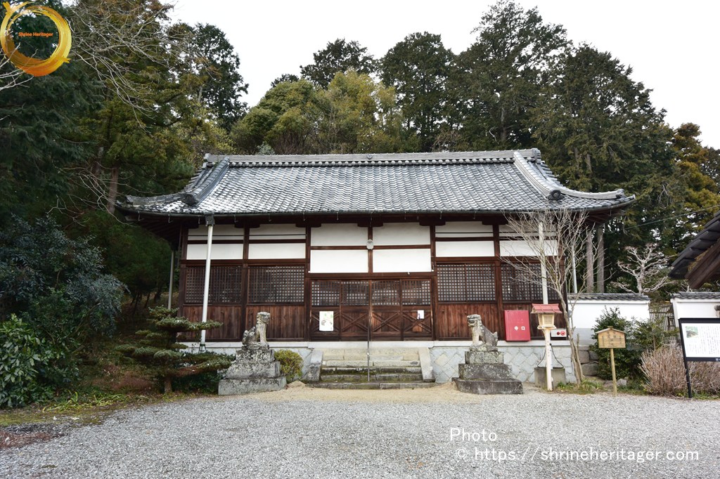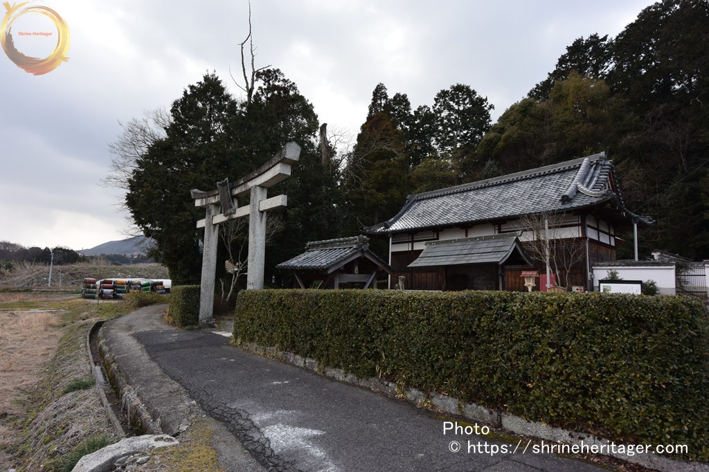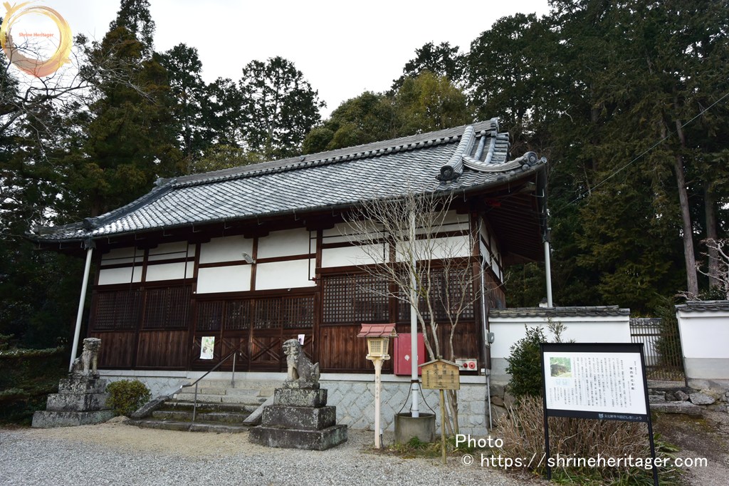 由緒 本社はもと倭文(シトリ)神社、或は波加仁志神社と称し 寺口 大屋 新庄 桑海 中戸 弁之 南道穂 北道穂 西室 東室 柿之本 北花 笛堂 曽大根の十四ヶ町村の総氏神として奉斎していたが、慶安年中に桑山氏が新庄に居住するに及び 新庄外七ヶ村を割いて宇佐神祠に属させてからは だんだん少なくなり 現在は寺口 大屋 二ヶ村の氏神である。