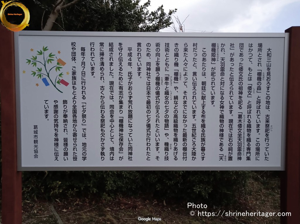 「棚機の森(たなばたのもり)」にはかつて 「倭文(しどり)」と呼ばれる織物を織る専門集団であった倭文氏の祖神を祀る「葛木倭文坐天羽雷命神社(かづらきしとりにいます あめのはづちのみことじんじゃ)」があったと伝えられています