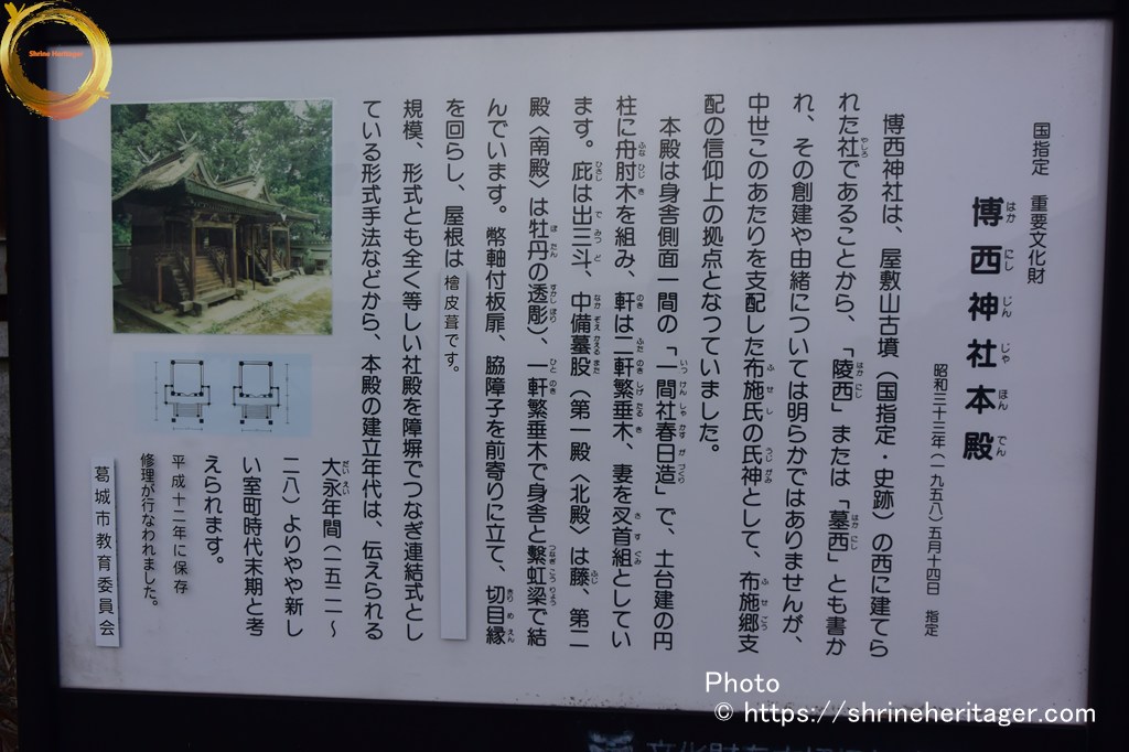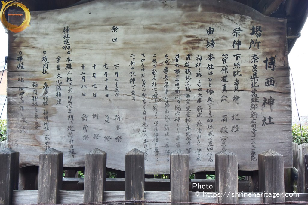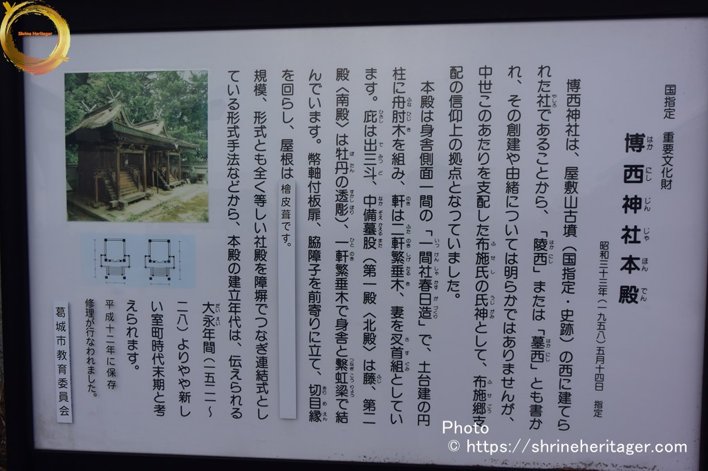 博西神社(はかにしじんじゃは 旧鎮座地は倭文氏の祖神を祀る「棚機の森(たなばたのもり)」と伝わり 往古より葛木倭文坐天羽雷神社と称し 波加仁志明神と唱えた 延喜式内社 大和國 葛下郡 葛木倭文坐天羽雷命神社(大 月次 新嘗)(かつらきの しとりにゐます あめのはづちのみことの かみのやしろ)とされます