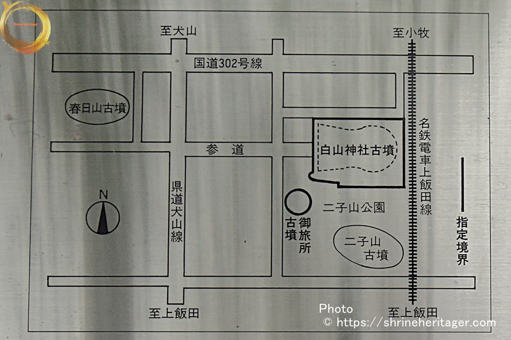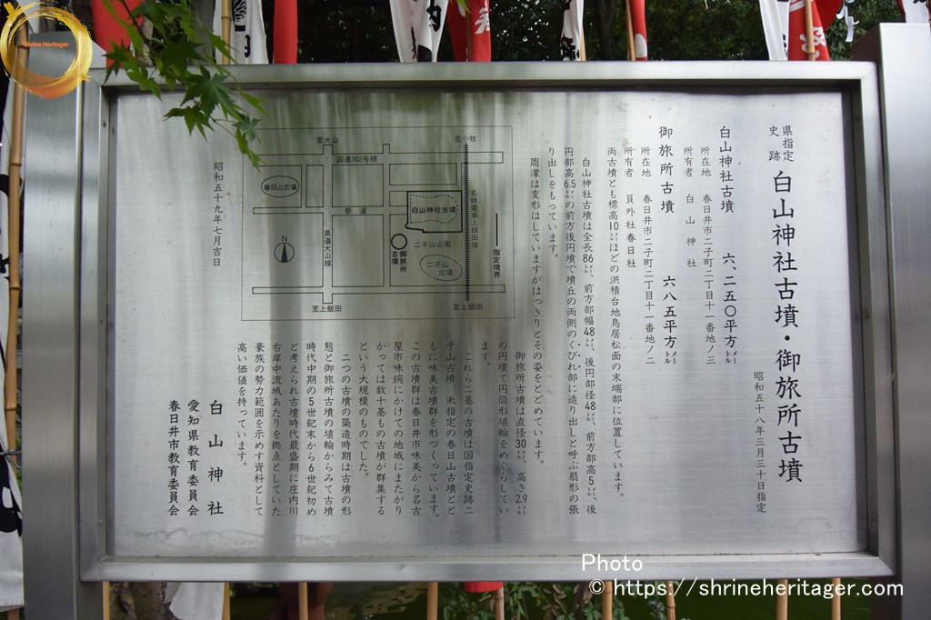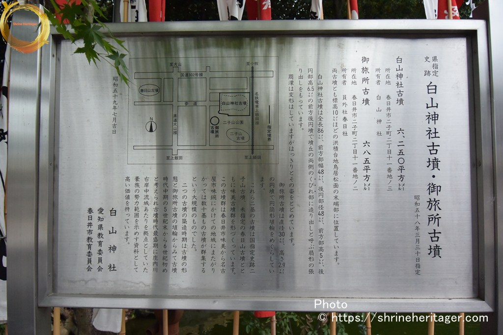 なお同じく県指定になっているお旅所古墳(円墳)の上にある御旅所は寛延年間(1750頃)までは西方、稲置街道(県道)を越えた春日山古墳の上にあった春日神社でしたが、街道を横断し通行の妨げになるとのことで今の場所に変更されました。その後大正年(1918)春日神社も白山神社に合祀され今日に至っております。