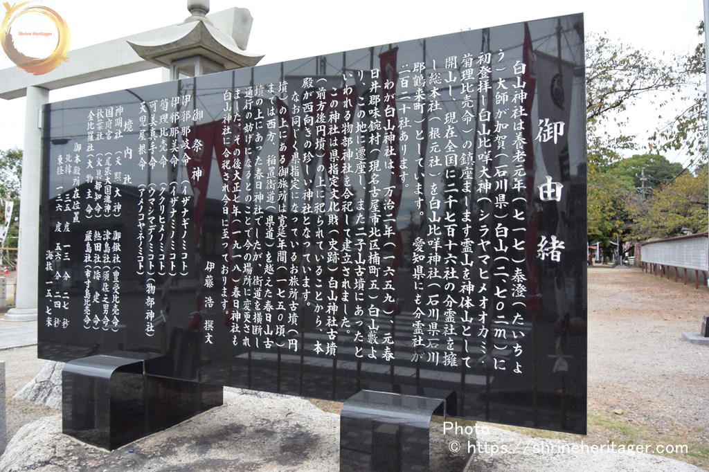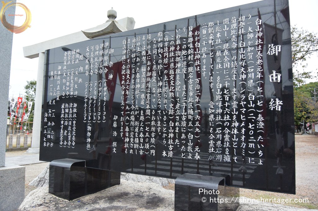 白山神社は養老元年(717)泰澄(たいちょう)大師が加賀(石川県)白山(2702m)に初登拝し白山比咩大神(シラヤマヒメオオカミ)(菊理比売命)の鎮座まします霊山を神体山として開山し、現在全国に2716社の分霊社を擁し総本山(根元社)を白山比咩神社(石川県石川郡鶴来町)としています。 愛知県にも分霊社が220社あります。