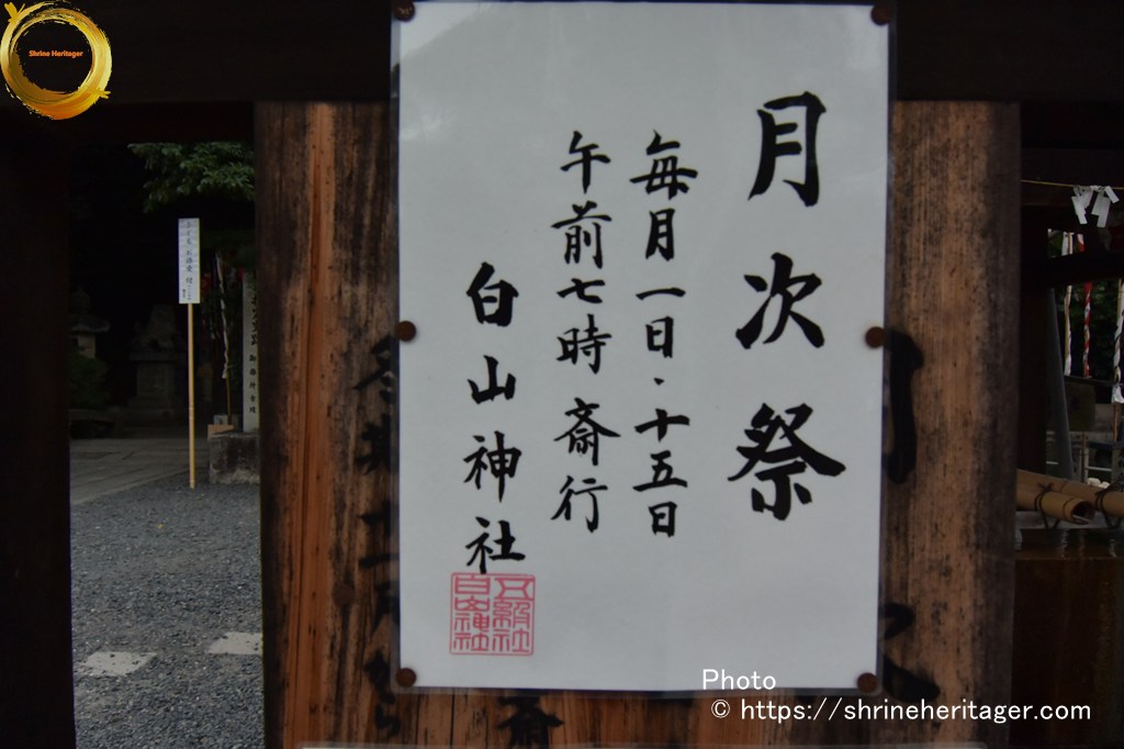 張り紙があり「月次祭 毎月一日・十五日 午前七時斉行」とあります