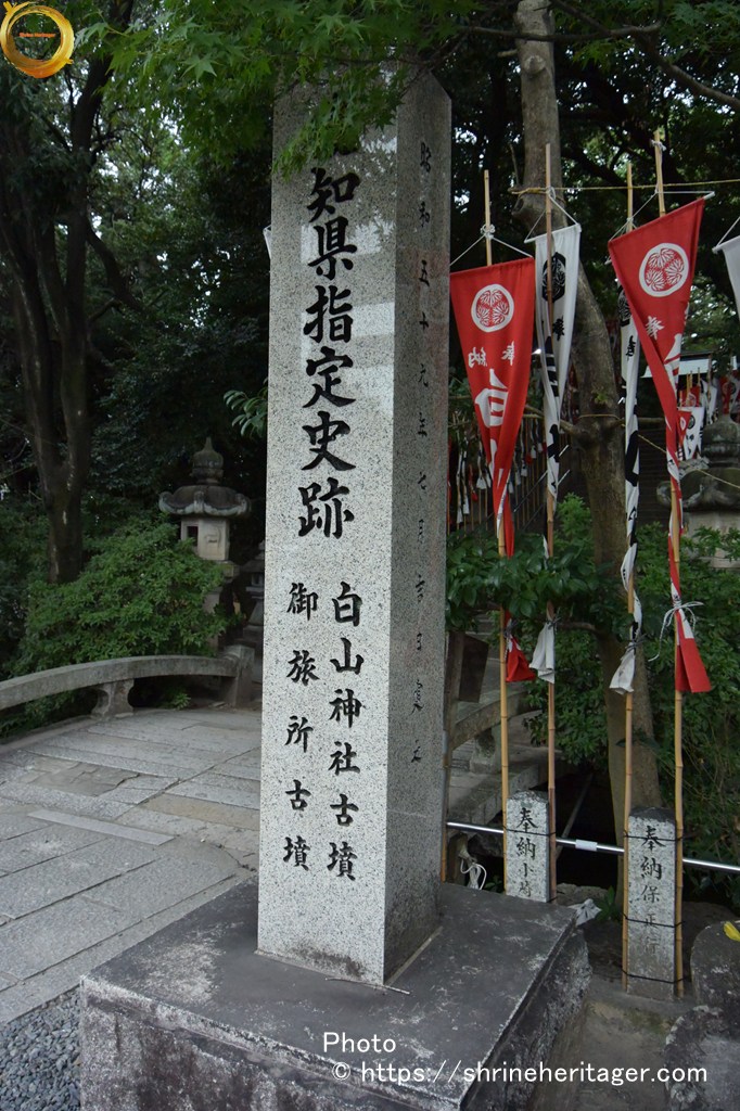 石橋の御神橋の手前に「愛知県指定史跡 白山神社古墳 御旅所古墳」の石柱があります