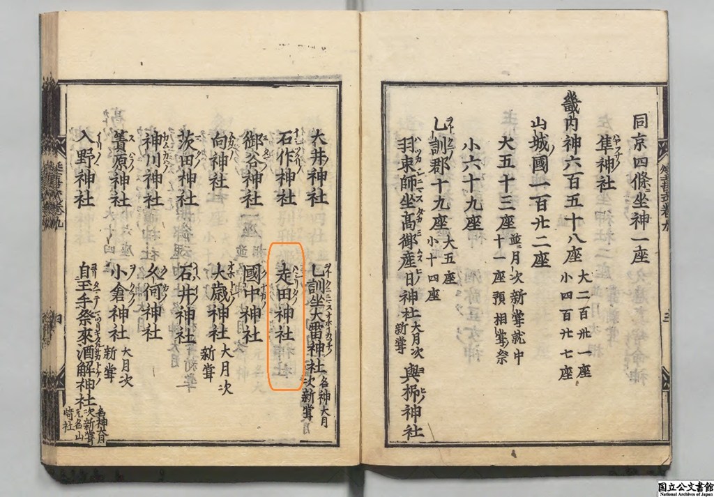 『延喜式神名帳』(927年12月編纂)に所載の「走田神社(はしりたの かみのやしろ)」について