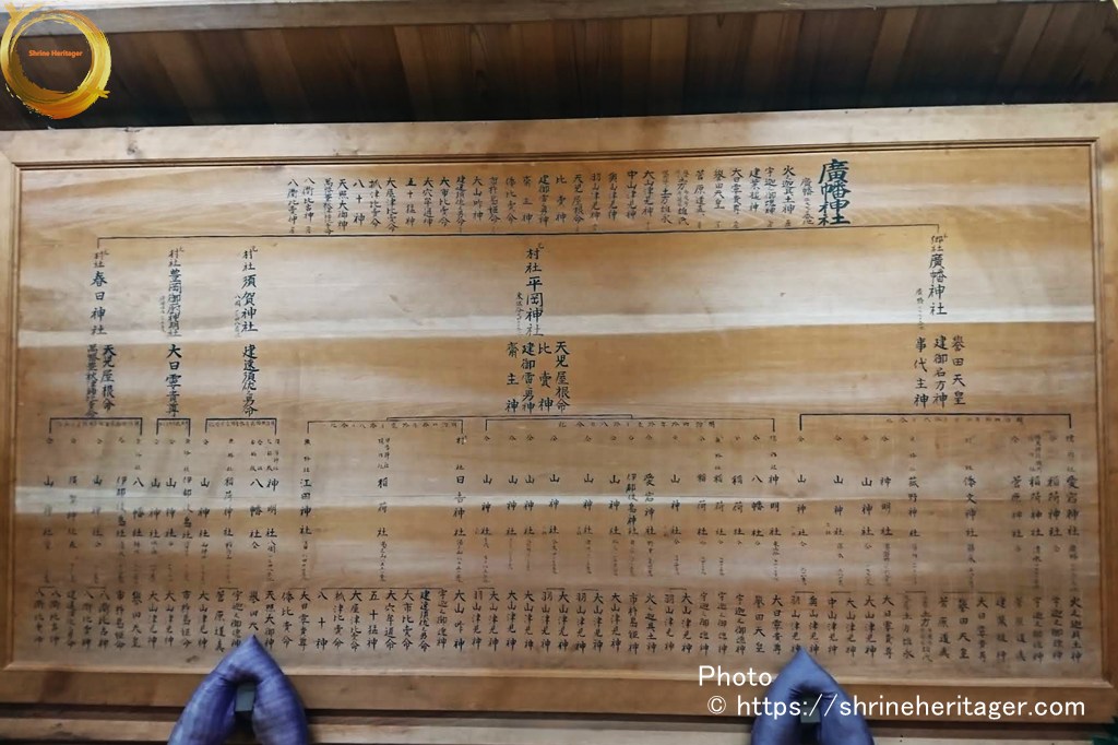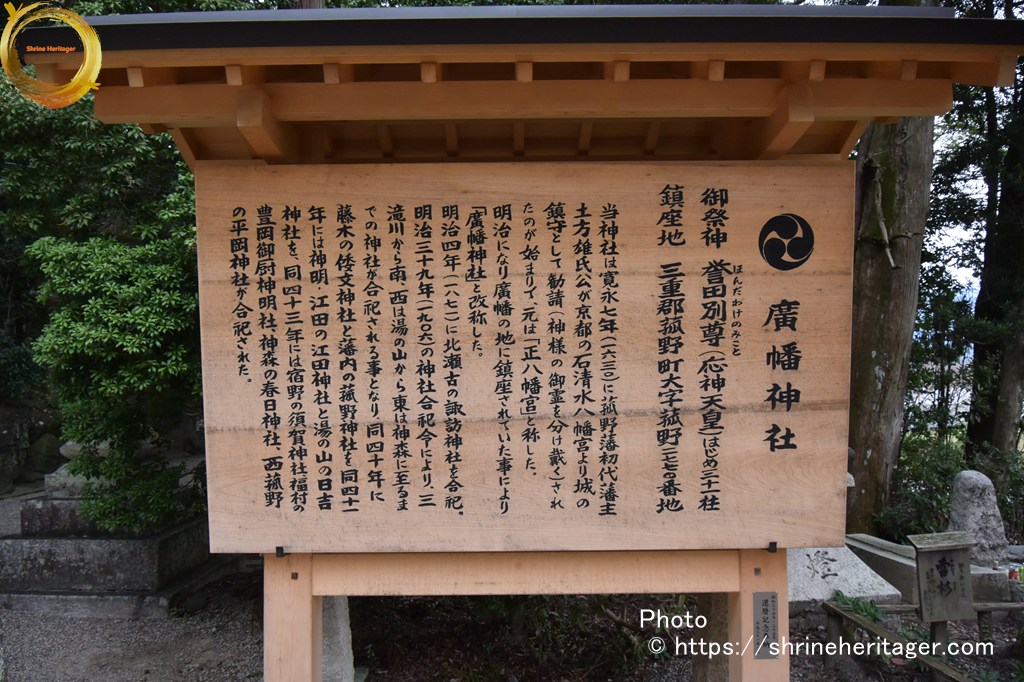 合殿の諏訪神社は菰野郷草創の社で村中里民の産土神なりしが慶長年中土方家並に藩士の産の産土神となる。慶長13年3月領主雄高公の命に依り諏訪神社を南山に奉遷す。明治4年10月23日菰野県庁の命に依り諏訪神社を正八幡宮に合祀して廣幡神社と改称し、明治6年三重県庁より第一大区456小区郷社と定められる。