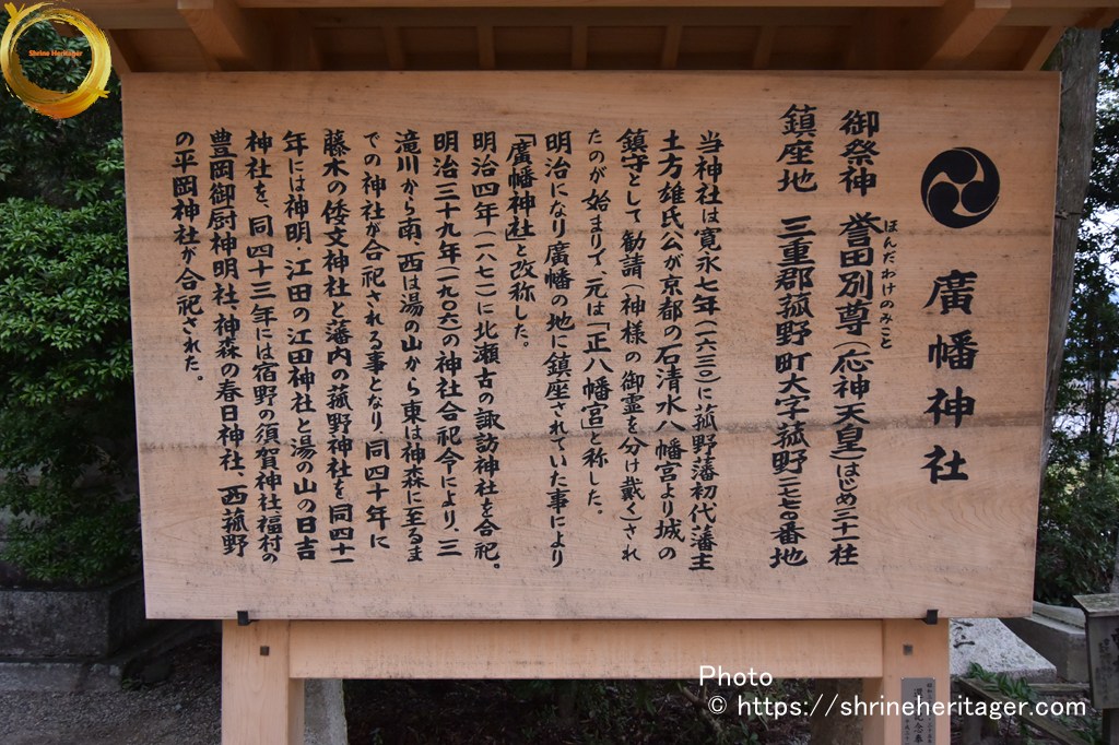 廣幡神社(ひろはたじんじゃ)は 寛永七年(1630)菰野藩初代藩主 土方雄氏公が京都の石清水八幡宮より城の鎮守として勧請 明治になり神社合祀令により近隣の神社が合祀されました 明治41年には式内論社 江田神社(江田)を合祀して 延喜式内社 伊勢國 三重郡 江田神社(えたの かみのやしろ)の論社となっています