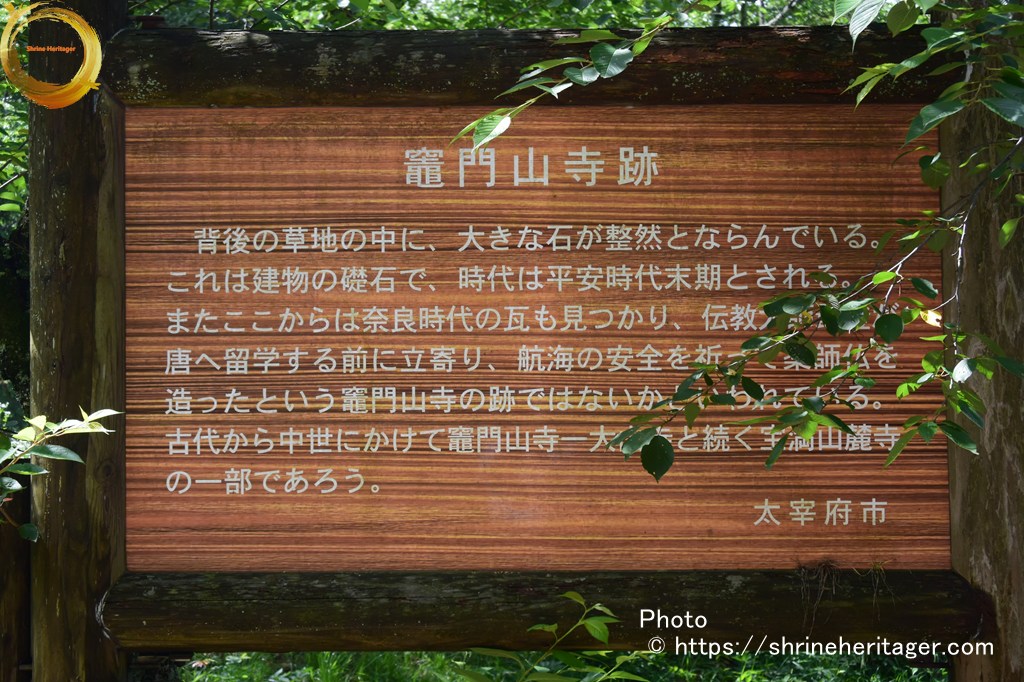 これは建物の礎石で、時代は平安時代末期とされる。またここからは奈良時代の瓦も見つかり、伝教大師最澄が唐へ留学する前に立寄り、航海の安全を祈って薬師仏を造ったという竈門山寺の跡ではないかといわれている。