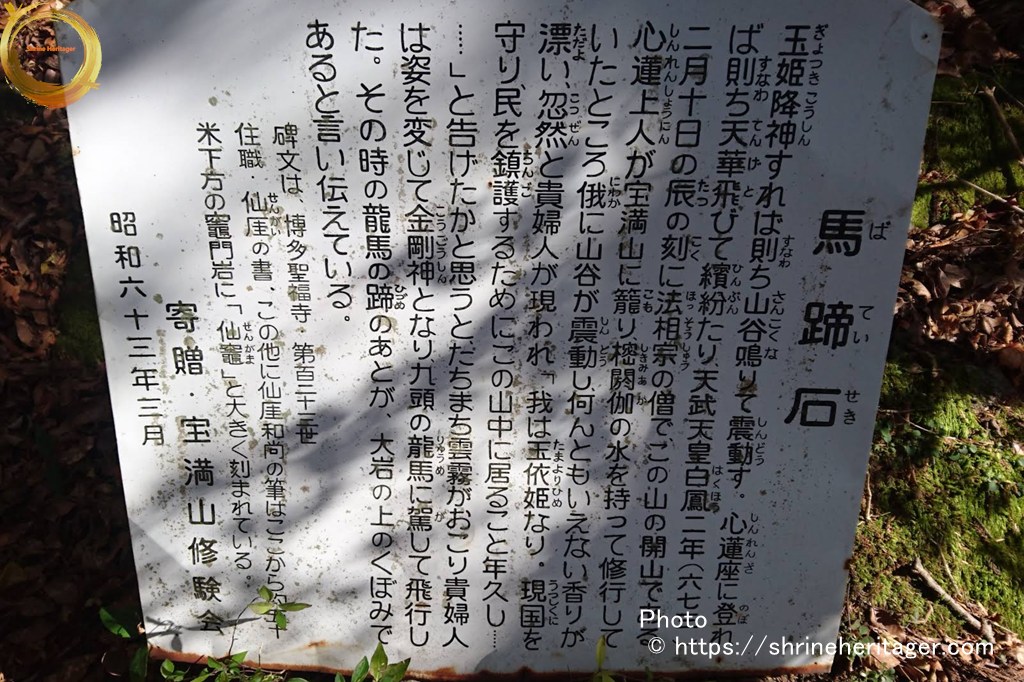 玉姫(ぎょつき)降神(こうしん)すれば則ち山谷(さんこく)鳴りて震動(しんどう)す、心蓮(しんれん)座に登れば則ち天華(てんげ)飛びて繽紛(ひんぷん)たり、天武天皇 白鳳(はくほう)二年(六七三)二月十日の辰の刻に、 法相宗(ほうそうしゅう)の僧でこの山の開山である心蓮上人(しんれんしょうにん)が、宝満山に籠(こも)り樒閼伽(しきみあか)の水を持って修行していたところ 俄(にわかに)に山谷が震動(しんどう)し何んともいえない香りが漂(ただよ)い、忽然(こつぜん)と貴婦人が現われ、「我は玉依姫(たまよりひめ)なり、現国(うつしくに)を守り、民を鎮護(ちんご)するためにこの山中に居ること年久し…」と告げたかと思うとたちまち雲霧がおこり 貴婦人は姿を変じて金剛神(こんごうしん)となり九頭の龍馬(りゅうめ)に駕(が)して飛行した。その時の龍馬の蹄(ひづめ)のあとが、大岩の上のくぼみであると言い伝えている。