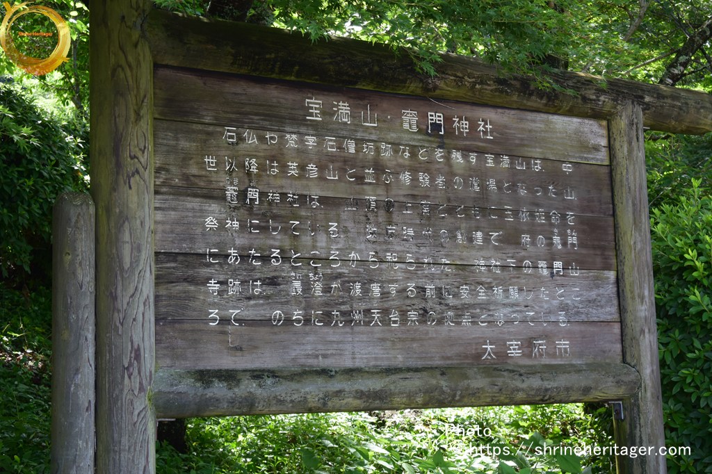 天智天皇の御時 都府樓を太宰府に建て給ふ際、竈門山は鬼門に當れるを以て 勅使を御山に遣し巖に御祭儀を仕へ奉らせ給へり。次で天武天皇 白鳳二年 有司に命じ給ひて 神殿を創設せられたり 是 竈門神社(寶満山)創立の始めにて、仁明天皇 承和七年四月勅使奉幣の事有り、延喜式制には名神大社に列せられ、白河天皇の御代には九州二島 總鎮守の神と崇められ、堀川天皇 嘉承元年には正一位を賜はり、鳥羽天皇 天永三年 勅使奉幣の事あり、歴代の御崇敬 極めて篤し。豊臣秀吉 太宰府に来りし時 殿の再築あり、黒田藩主の入園以來 更に社殿の再築等ありしが、明治維新後は神佛の混合を解かれ、全山の社殿佛舎は破せられ只一字の社殿のみ残されて村社に列し、明治二十八年十月官幣小社に御昇格仰出さる。斯くて御神感は舊に倍して四海に普き靈山たり且つ名山たる竈門山は、永く久しく神靈の鎭座まします靈域たり。