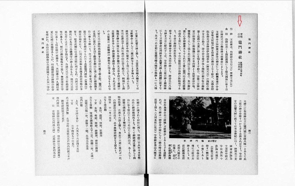 按ずるに玉依姫命を中央主祭の神とし、神功皇后 八幡大神を左右に配祀せしは、宇佐神宮三座の神と御同神にして 玉依姫命は同神宮の比賣大神と御同體に座すなり。其は一の宮記に當國 筥崎八幡宮の祭神も一に八幡大神 二に聖母皇后 三に竈門號に筥崎八幡 一とありて此三座の神は分離すべからざる由縁あればなり。