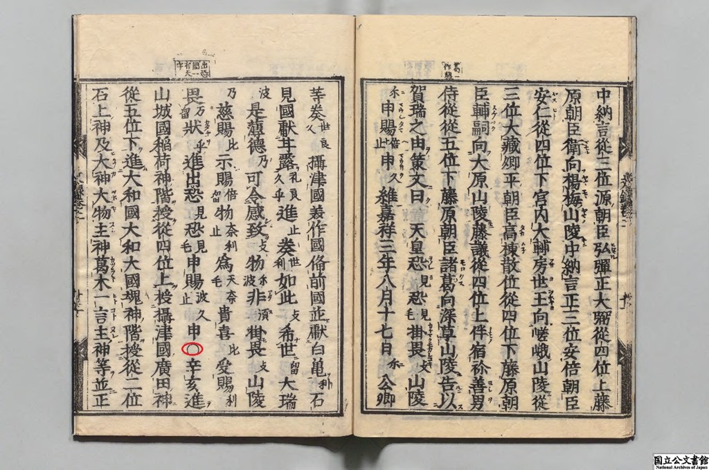 文徳天皇 嘉祥三年十月辛亥、正五位下を加へ、〔文徳実録○按本書、正を従に作る誤れり、類聚國史に據て之を訂せり、又 本書及類聚國史に下を上と作るもの 又誤れり、今 三代実録、貞観元年の文に據て之を訂す、〕