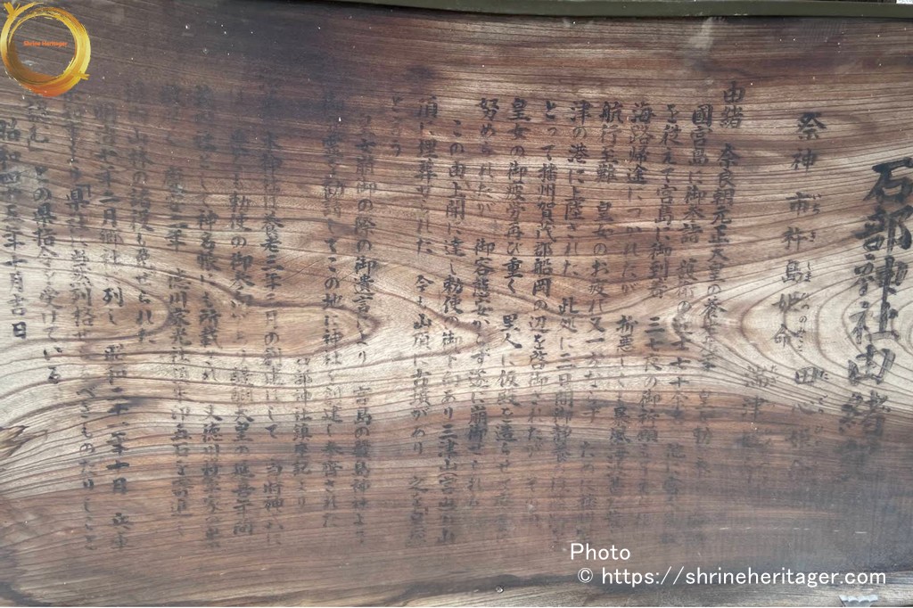 創祀は、元正天皇の御宇 養老三年三月であると云ふ。延喜式に「石部(イソベノ)神社」として、載せられてあるのが、當神社である。