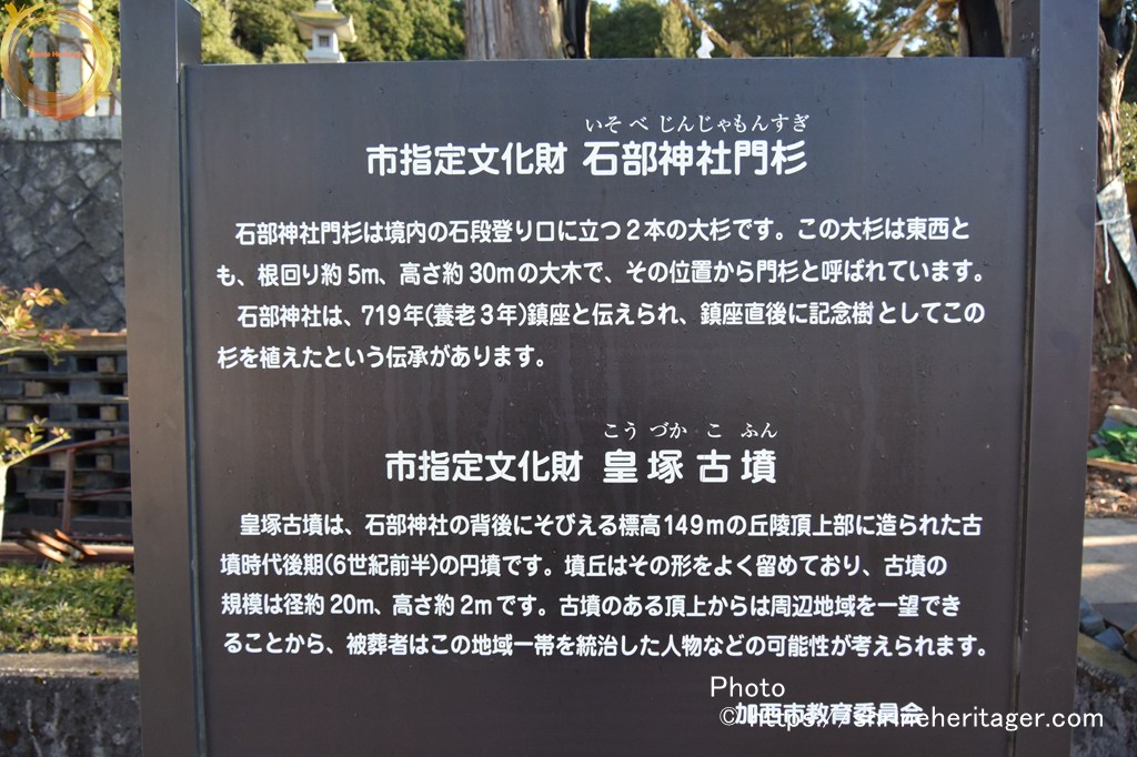 石部神社(いそべじんじゃ)は 伝説には この地で薨じられた皇女の遺言により養老三年(719)安藝の宮嶋から勧請と云う 又 皇女の墓とされる皇塚古墳は 古墳時代後期(6世紀前半)の円墳で被葬者はこの地域一帯を統治した人物などの可能性が考えられます 延喜式内社 播磨國 賀茂郡 石部神社(いそへの かみのやしろ)の論社です
