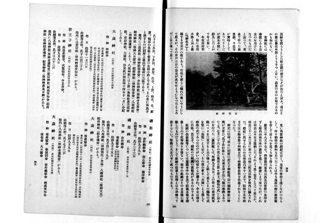 氏子は上芥田、下芥田、廣原、佐谷、上野、越水、北、殿原、鴨谷の各區と笹倉の在田小路とである。その外に外氏子と稱するのが別所 上道山 下道山の三區である。