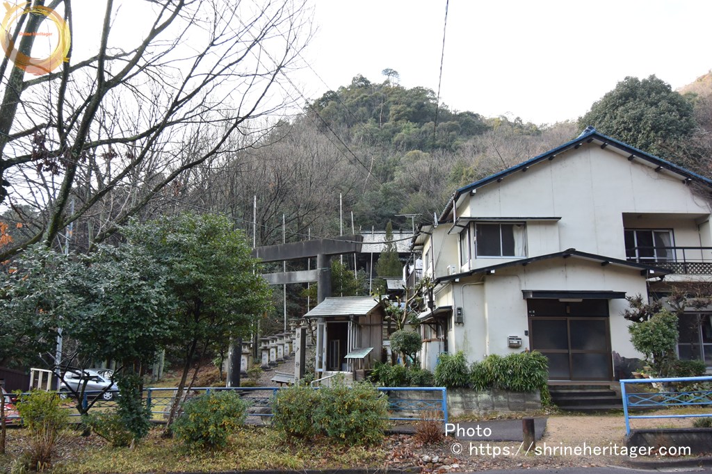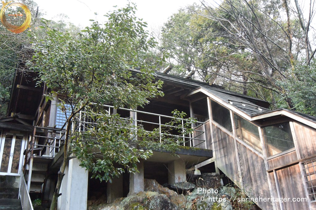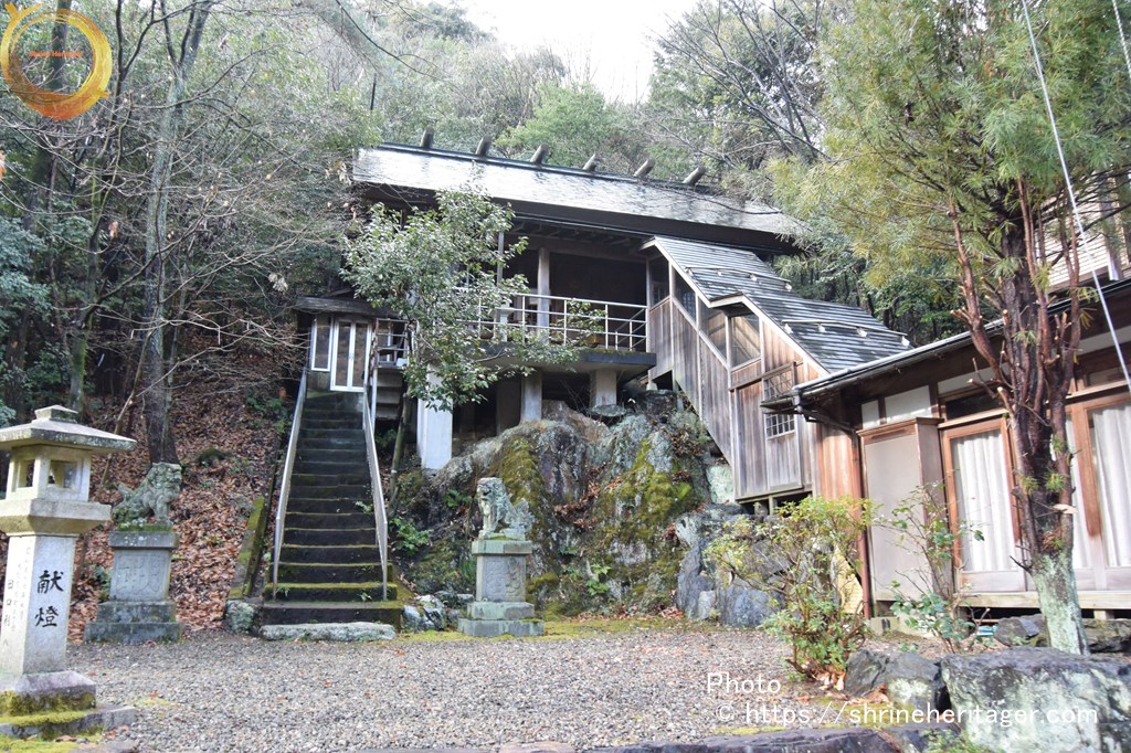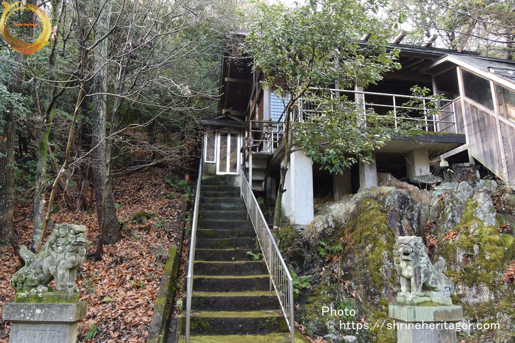 社殿は 岩盤の上に祀られていて 参集殿からは 階段状の渡殿があります
