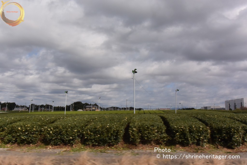 神社の西側には天竜川が流れていて 東側は河岸段丘となっていて 茶畑が広がります