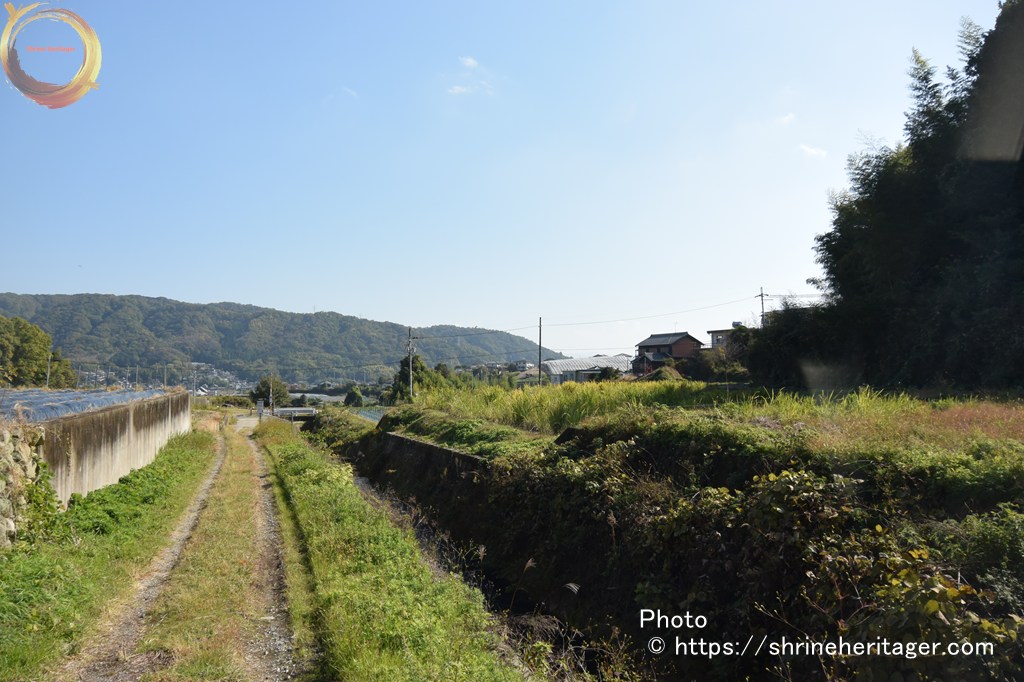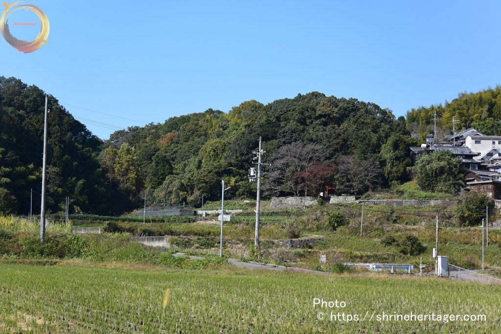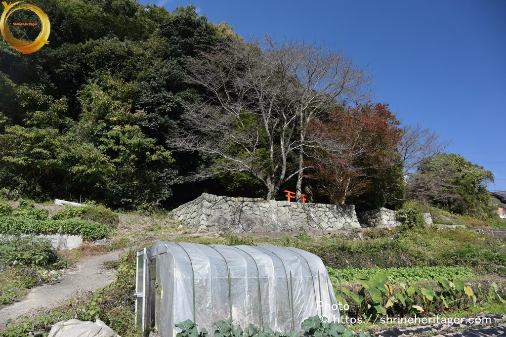 越木塚集落の南側、竜田川の支流、伊文字川の川沿い近くに鎮座。