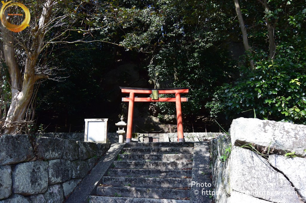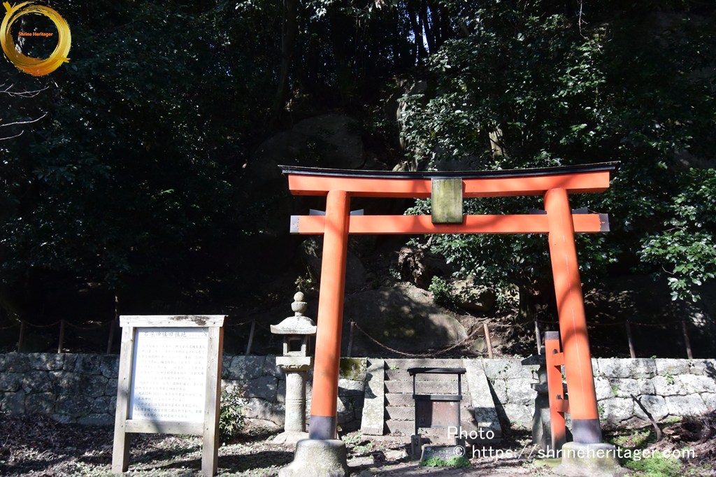 越木塚集落の南東部、伊文字川(いもじがわ)流域を見おろす位置にあり、本殿や拝殿は当初からなく、鳥居と社務所があっただけで、崖面に露頭(ろとう)した高さ約6m、幅10数mの巨大な「陰石(いんせき)」を御身体としている。『延喜式』に記載のある式内社で、祭神は剣刃石床別命。貞観元年(859)には従五位上を授けられている。