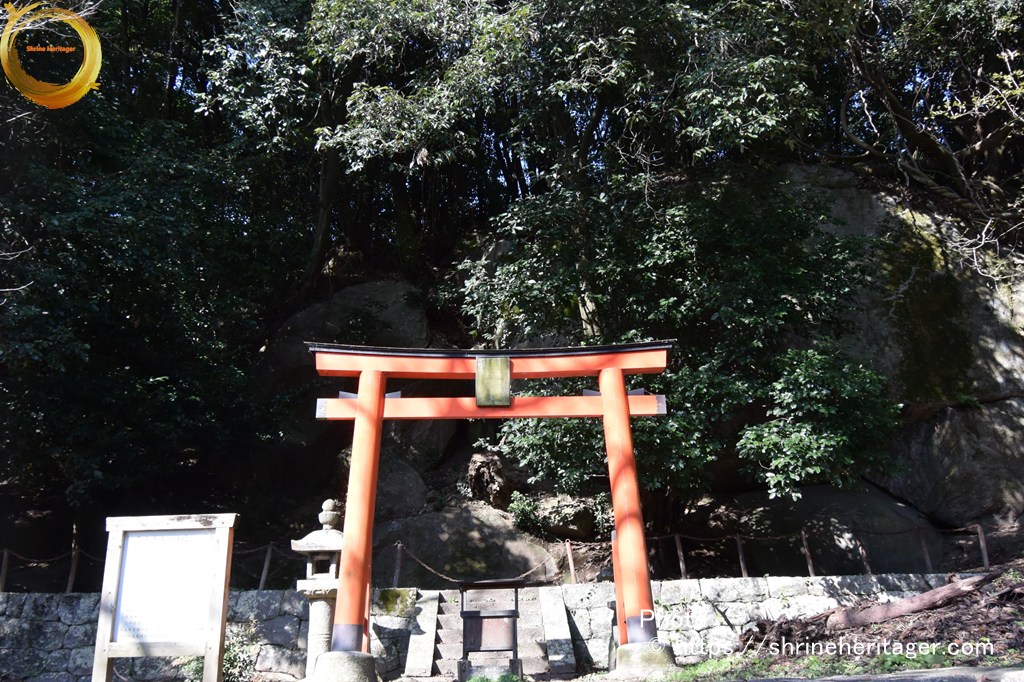 社殿はなく 朱塗りの鳥居とともにご神体の巨岩(高さ約6メートル 幅十数メートル)が太古のまま 石垣の上に鎮座しています