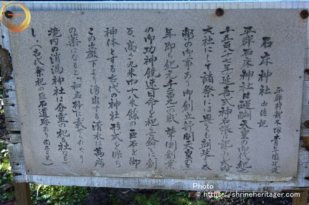 神社覈録ニ云「本草和名云 石牀〔乳水下凝積生如箏状〕一名乳床、一名逆石、出ニ鍾乳中・・・・・往昔は此地 石床の出たる所にて其霊を祭れる社なるべし、備中國鐘乳穴神社あるをも考へ合すべし」ト。以テ證スベシ。註 祭神ハ明細帳ニ「劔刀石床別命」ト、特選神名牒ハ「石床別命」トアリ。