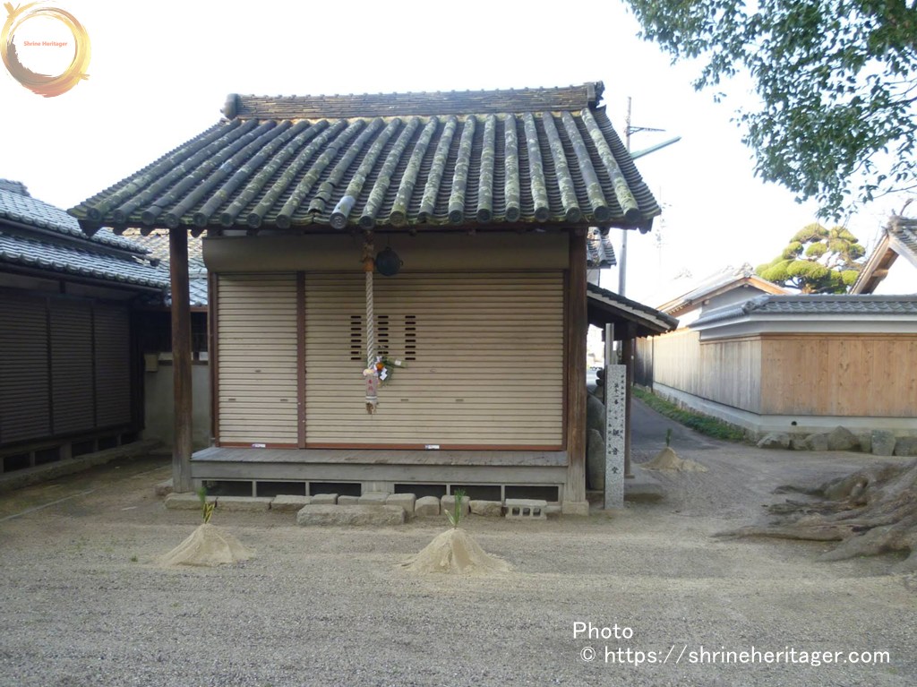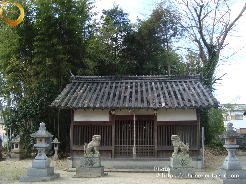 基壇上に建ち、土台を廻し、身舎丸柱、柱上部粽付、大斗、三ツ斗組、向拝、柱方柱面取り、柱天端大斗、連三ツ斗組、虹梁、象鼻、中備蟇股、身舎とは海老虹梁で繋ぐ。軒廻り1軒繁垂木、三方に縁を設け、背面に脇障子、跳高欄、昇高欄、宝珠柱付、木階9級、正面中央には、格子戸両開きの建具を用い、他面は板壁である。拝殿奥の一段高い所に建築されているが、隅木入り社殿は珍しく、全体に成の高い社殿で、明治頃の建設かも知れない。